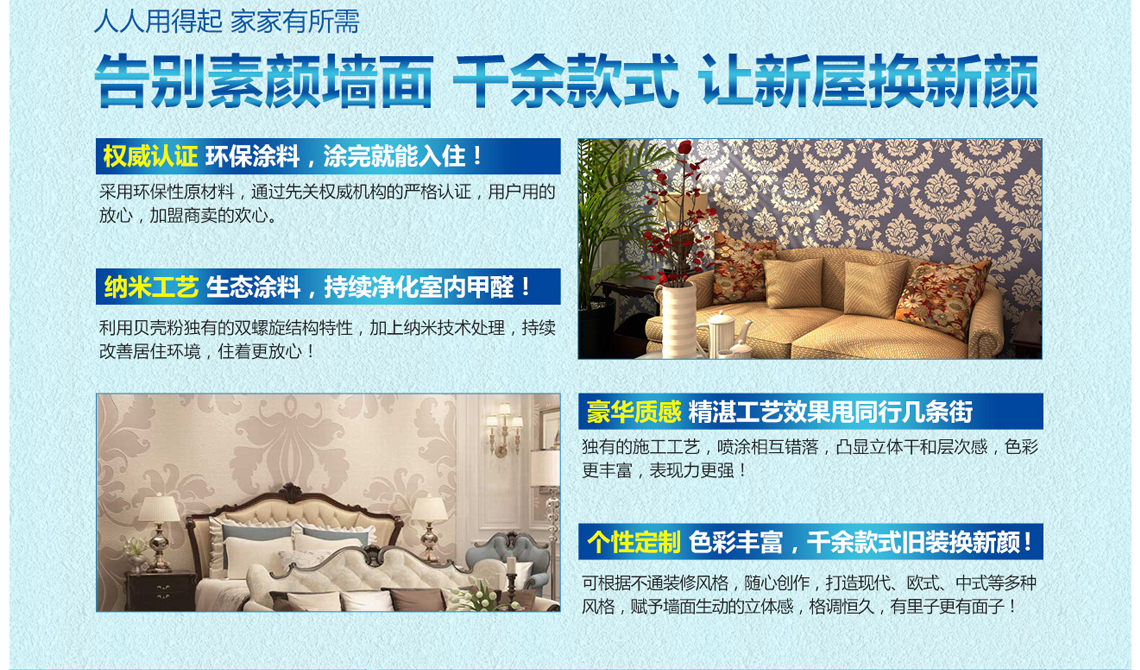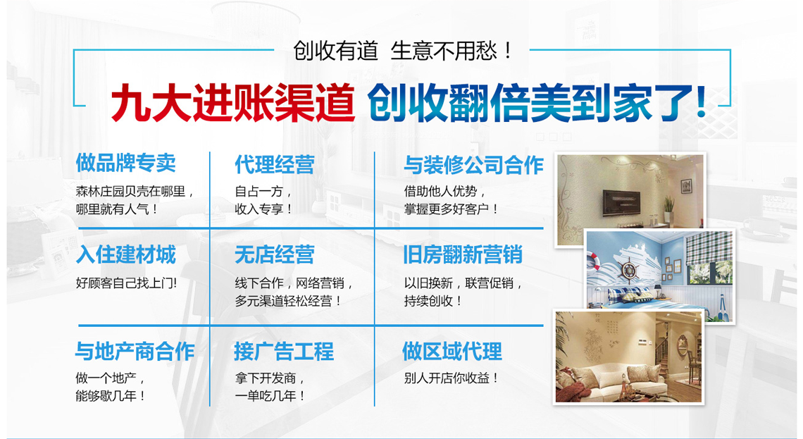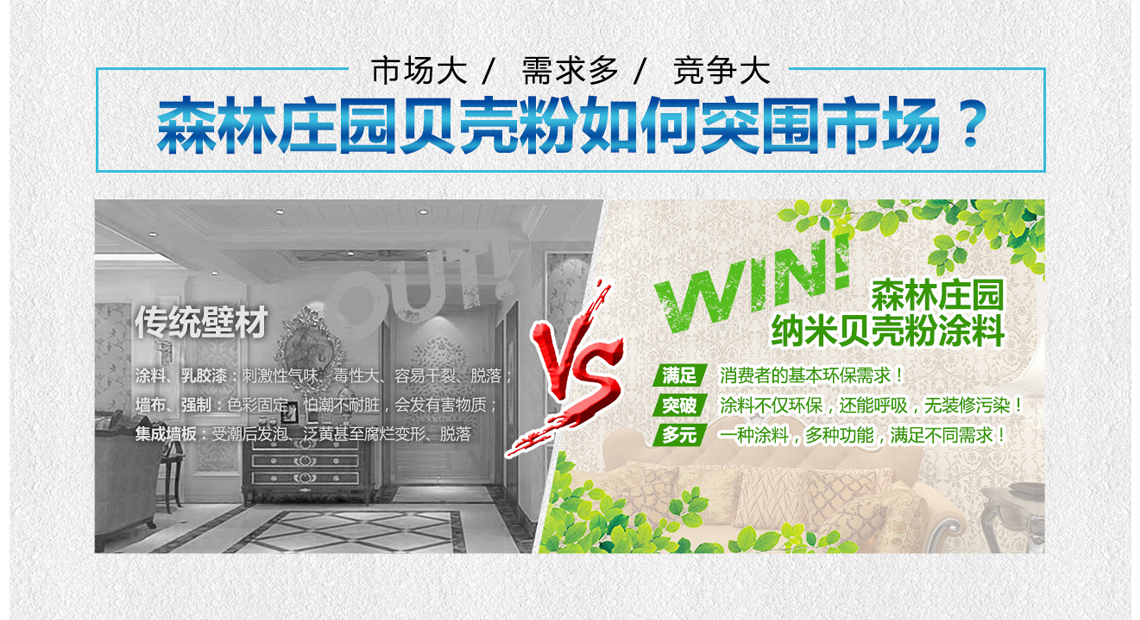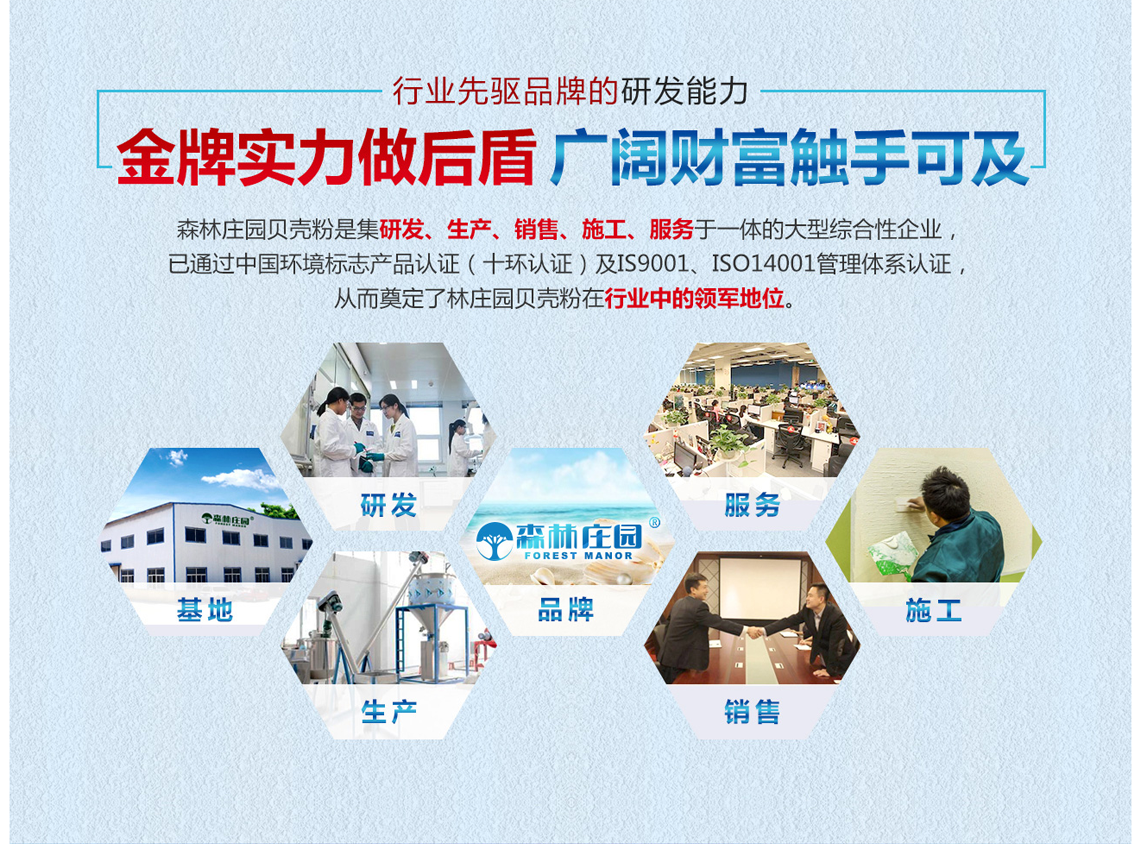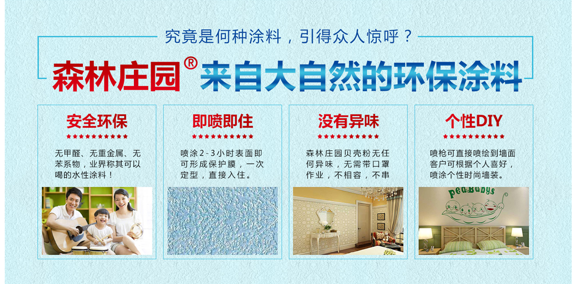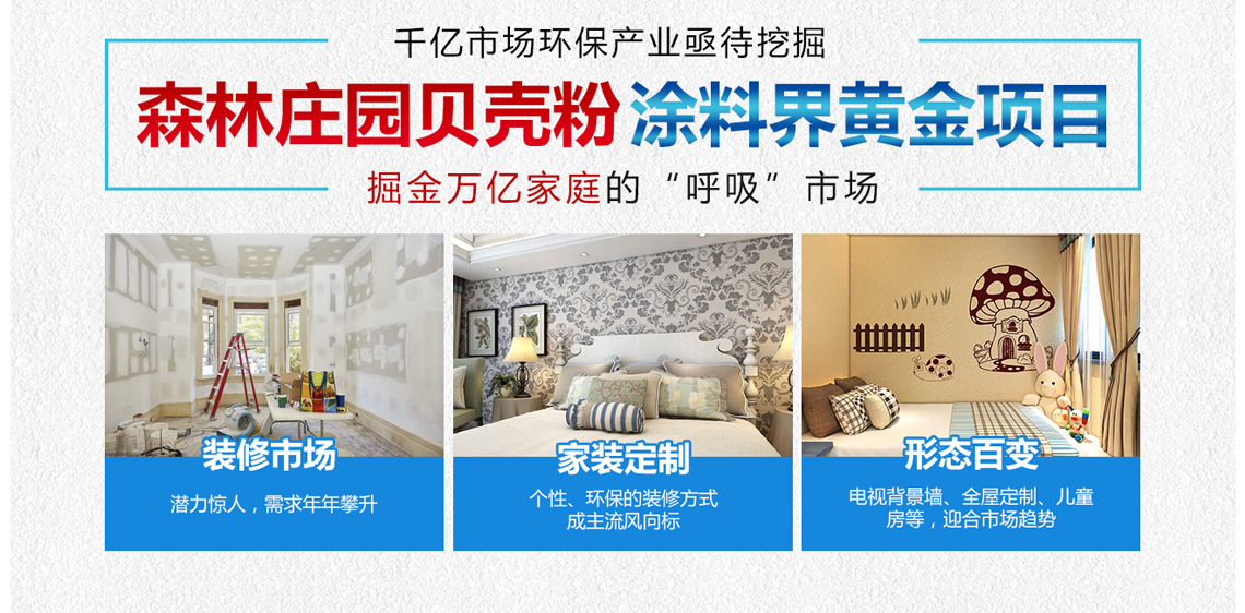 森林庄园贝壳粉是以海洋天然贝壳为主要原材料,具有净化甲醛、呼吸调湿、防霉抗菌净化空气、不吸灰尘、使用寿命长等多项环保功能的新型墙面装饰壁材。这些产品不但可以满足消费者对于室内装修风格的各种需求,也为公司开拓了广阔的环保市场。不断累积的技术及推出新的环保服务,成为泛亚环保及其加盟商们不断开拓市场,发展壮大,累积财富的坚实基础。
