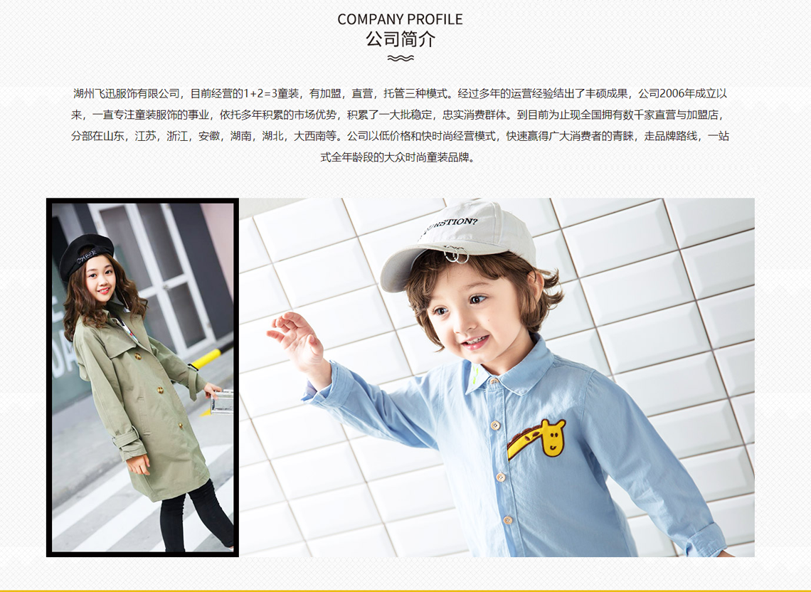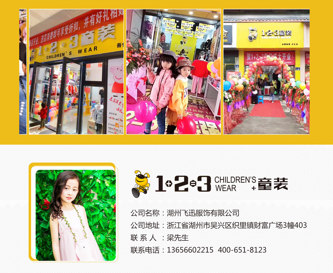 湖州飞迅服饰有限公司,目前经营1+2=3品牌童装,有加盟,直营,托管三种模式。经过多年的运营经验结出了丰硕成果,从公司成立以来,一直专注童装服饰的事业,依托多年积累的市场优势,积累了一大批稳定,忠实消费群体。到目前为止现全国拥有数千家直营与加盟店,分部在山东,江苏,浙江,安徽,湖南,湖北,大西南等。公司以低价格和快时尚经营模式,快速赢得广大消费者的青睐,走品牌路线,一站式全年龄段的大众时尚童装品牌