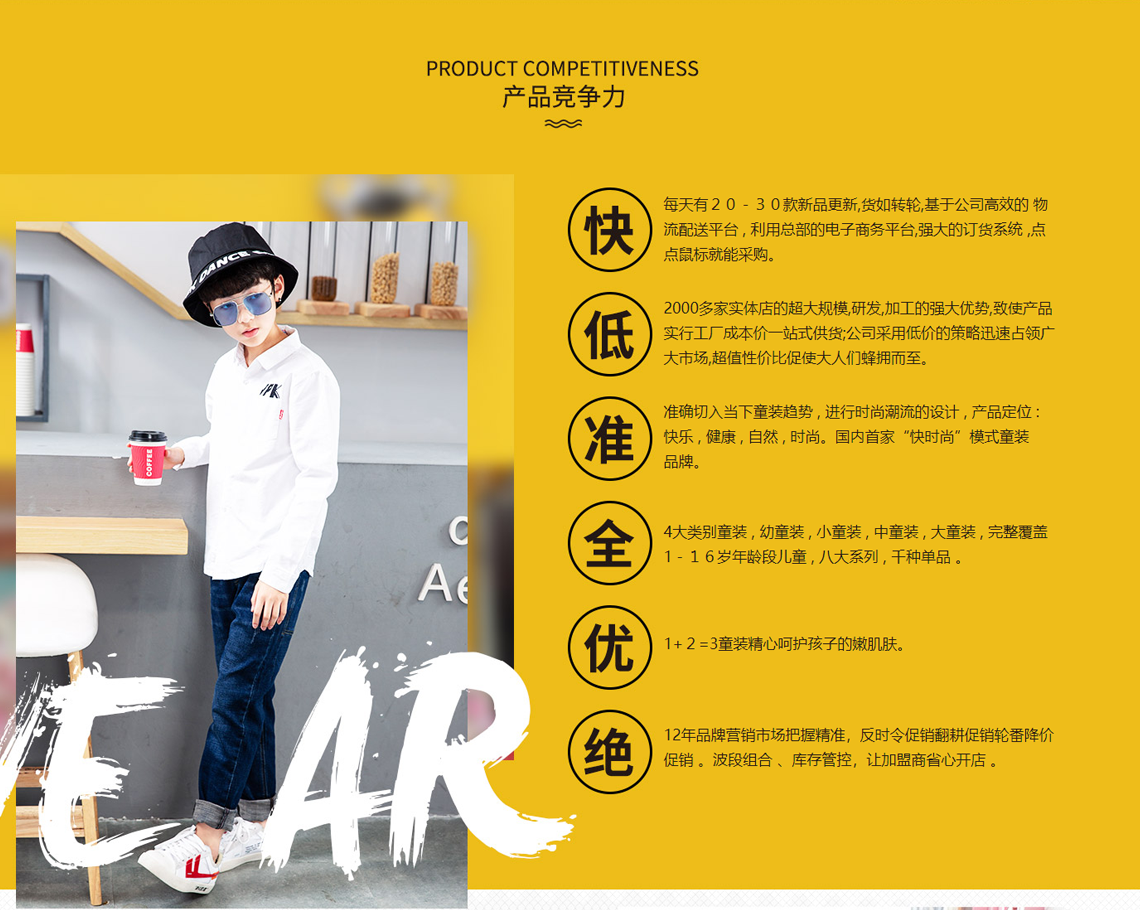 全:五大类别童装,婴儿装,幼童装,小童装,中童装,大童装,完整覆盖0-16岁年龄段儿童,八大系列,千种单品