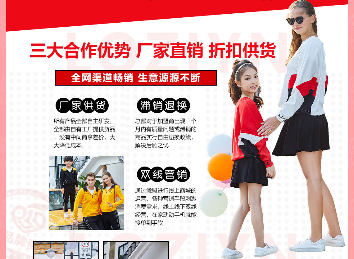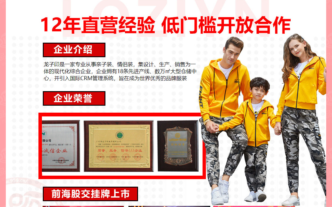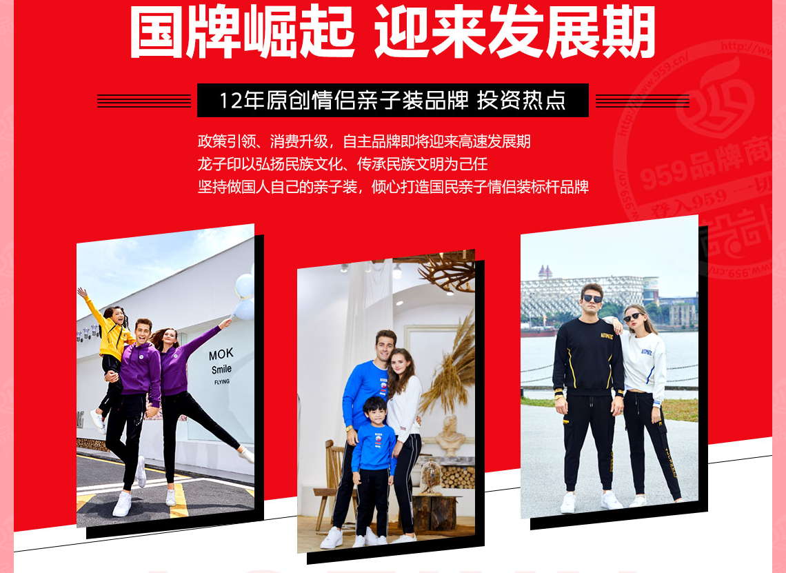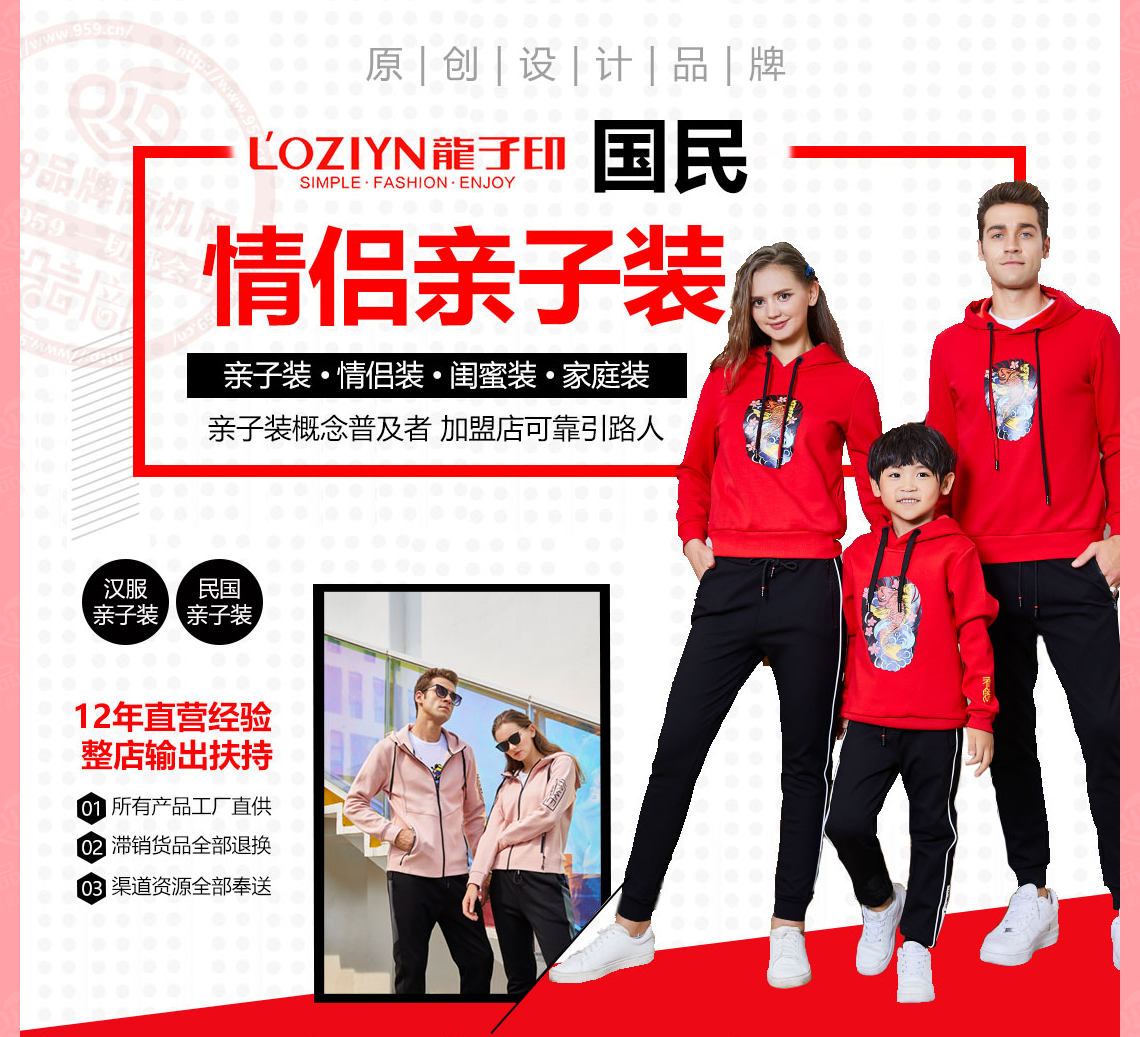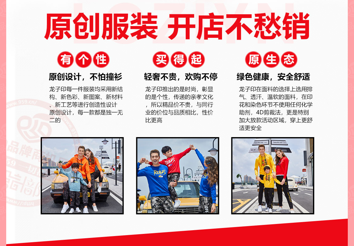 政策引领、消费升级,自主品牌即将迎来高速发展期,龙子印以弘扬民族文化、传承民族文明为已任,坚持做国人自己的亲子装,倾心打造国民亲子情侣装标杆品牌!龙子印是一家专业从事亲子装、情侣装,集设计、生产、销售为一体的现代化综合企业,企业拥有18条先进产线、数万㎡大型仓储中心,并引入国际CRM管理系统,旨在成为世界优秀的品牌服装。采用新结构、新色彩、新图案、新材料、新工艺等进行创造性原创设计,每一款都是独一无二的。推出的是时尚,彰显的是个性,与同行业的价位与品质相比,性价比更高。面料上选用排气、透汗、温软面料,无任何化学助剂,穿上更舒适更安全。所有产品全部自主研发,自有工厂提供货品,没有中间商拿差价,大降低成本。对于出现有质量问题或滞销的商品,实行自由退换政策,解决后顾之忧。线上线下双线经营,在家动动手机就能接单到手软。