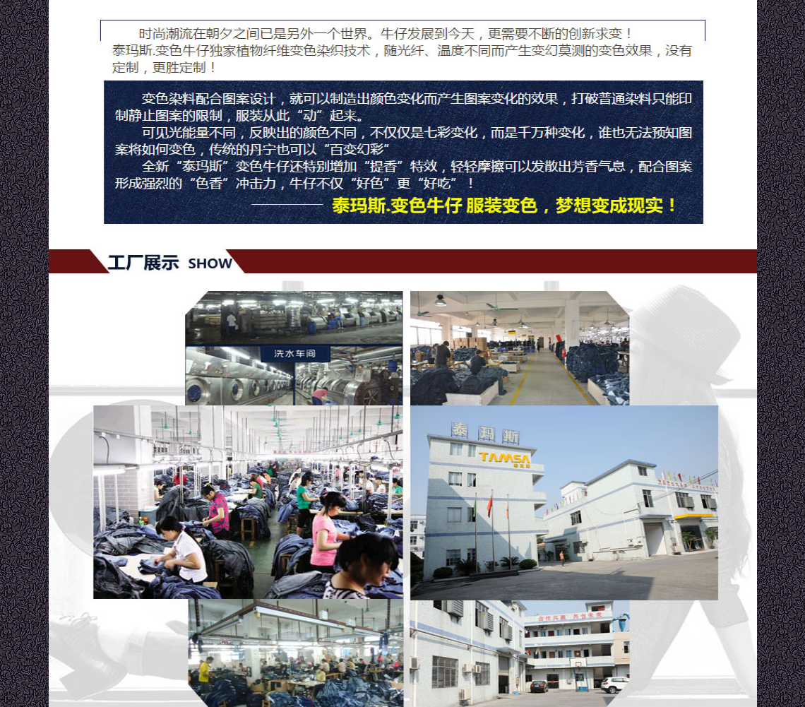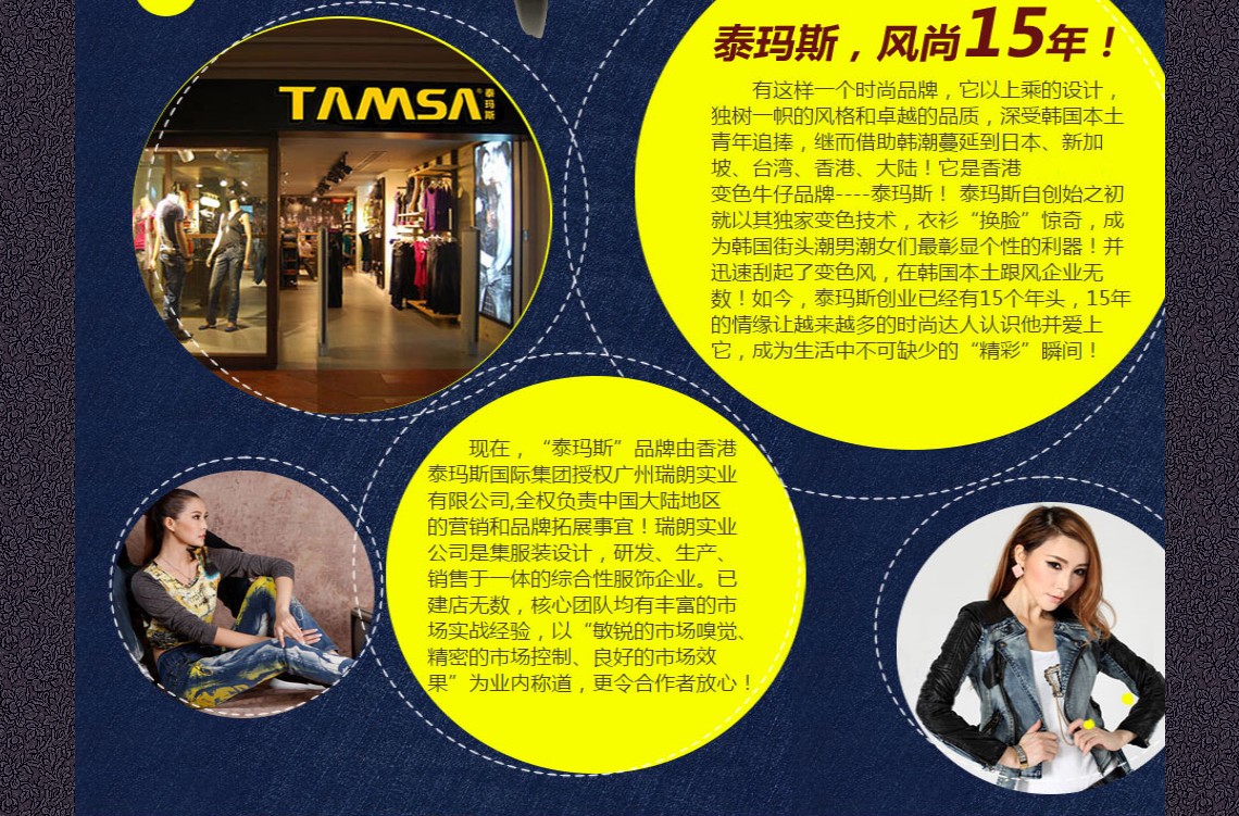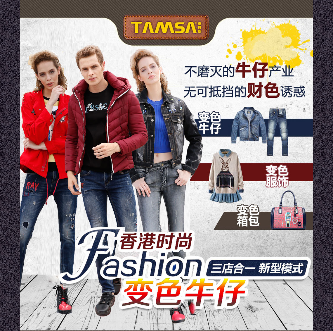 男人女人,衣柜中永远需要拉风的牛仔。白边魔幻力量,是“泰玛斯”变色牛仔赋予的潜质;灵动生活色彩,是“泰玛斯”给予的承诺。走入“泰玛斯”,更挑剔的目光也被终结,略有犹豫,唯恐错失。泰玛斯.变色牛仔独家植物纤维变色染织技术,随光纤、温度不同而产生变幻莫测的变色效果,没有定制,更胜定制!