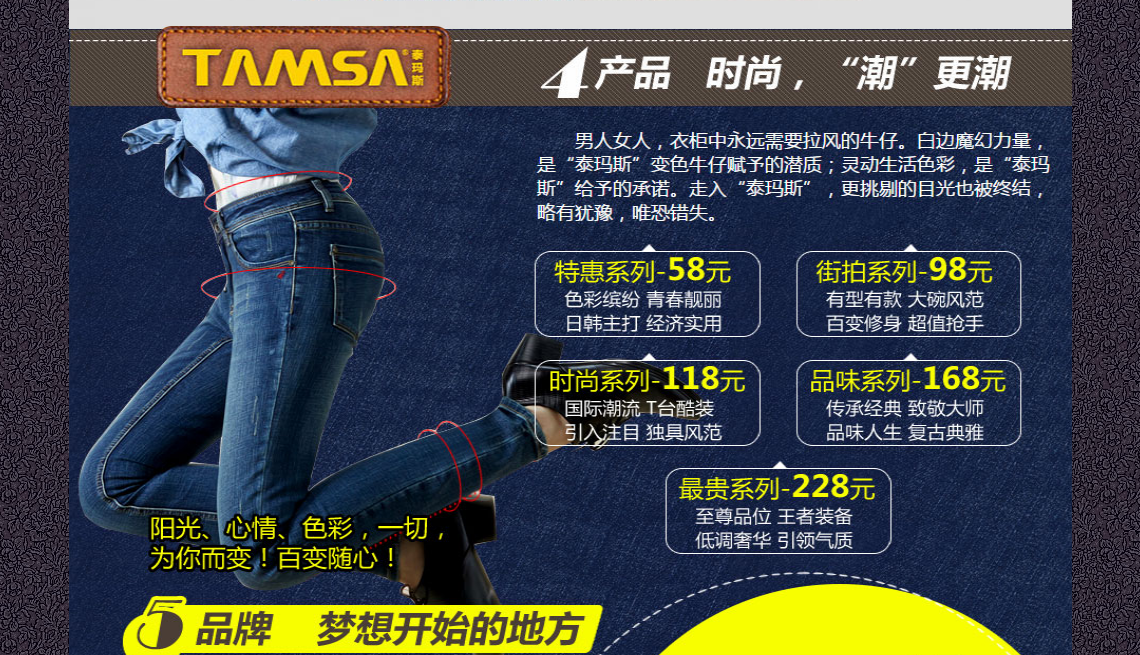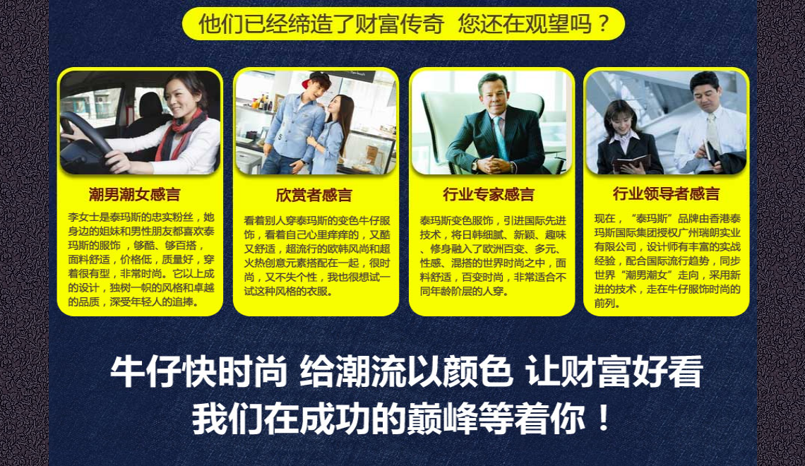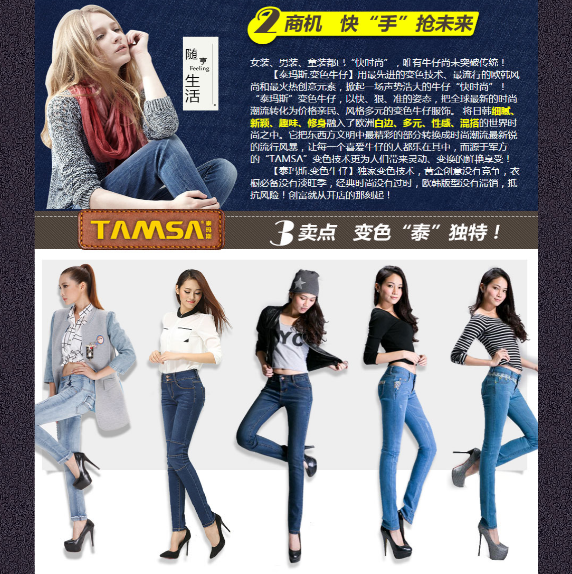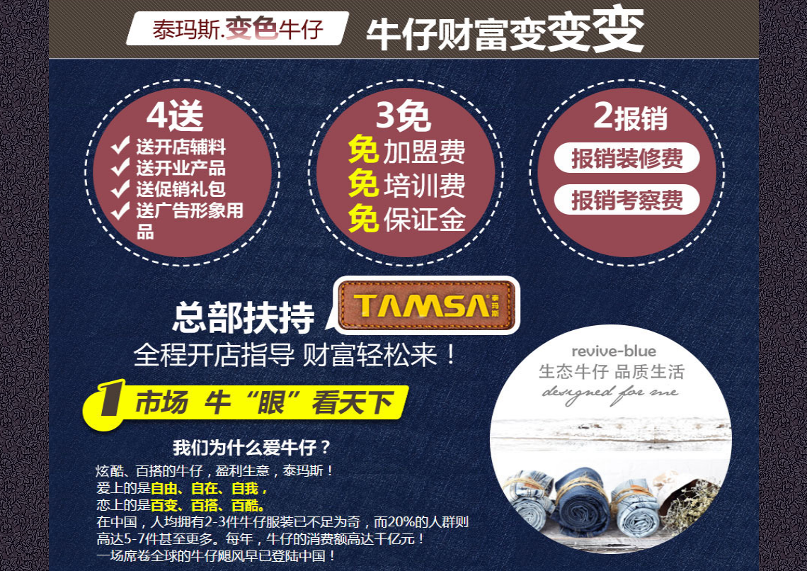 男人女人,衣柜中永远需要拉风的牛仔。白边魔幻力量,是“泰玛斯”变色牛仔赋予的潜质;灵动生活色彩,是“泰玛斯”给予的承诺。走入“泰玛斯”,更挑剔的目光也被终结,略有犹豫,唯恐错失。泰玛斯.变色牛仔独家植物纤维变色染织技术,随光纤、温度不同而产生变幻莫测的变色效果,没有定制,更胜定制!