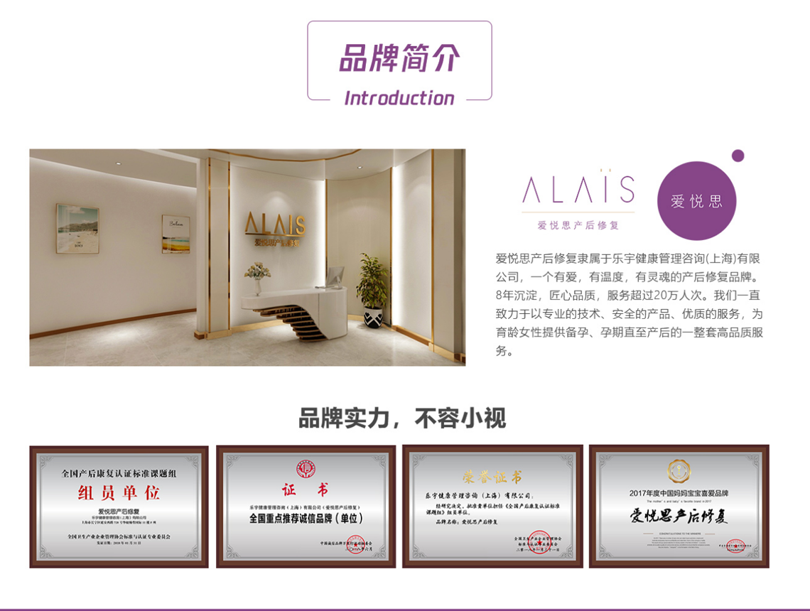 爱悦思产后修复专家隶属于乐宇健康管理咨询(上海)有限公司,专注女性健康事业,为育龄女性提供备孕、孕期直至产后的一整套修复方案。 2013年成立至今,爱悦思将每一道标准化服务流程做到完美,提供符合国际标准的一流服务;针对性的国际尖端科技组,结合传统精髓,带来卓越显著的效果提升:全面关注产后女性身体、心理的全方位修复,根据不同育龄女性制定阶段性修复方案,个性化方案由专家精确设计。开创性提出【六位一体】产后修复理念:天然有机产品、国际尖端设备、孕产独家手法、古法调理方案、个性居家方案、定制饮食调理。