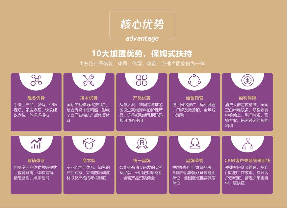 立体化托管式运营服务,全国终端活动策划、母婴类垂直SNS渗透、全网搜索引擎推广、移动端社群营销、新媒体全面覆盖营销方式。对加盟商实行360度全方位盈利屏障保护。