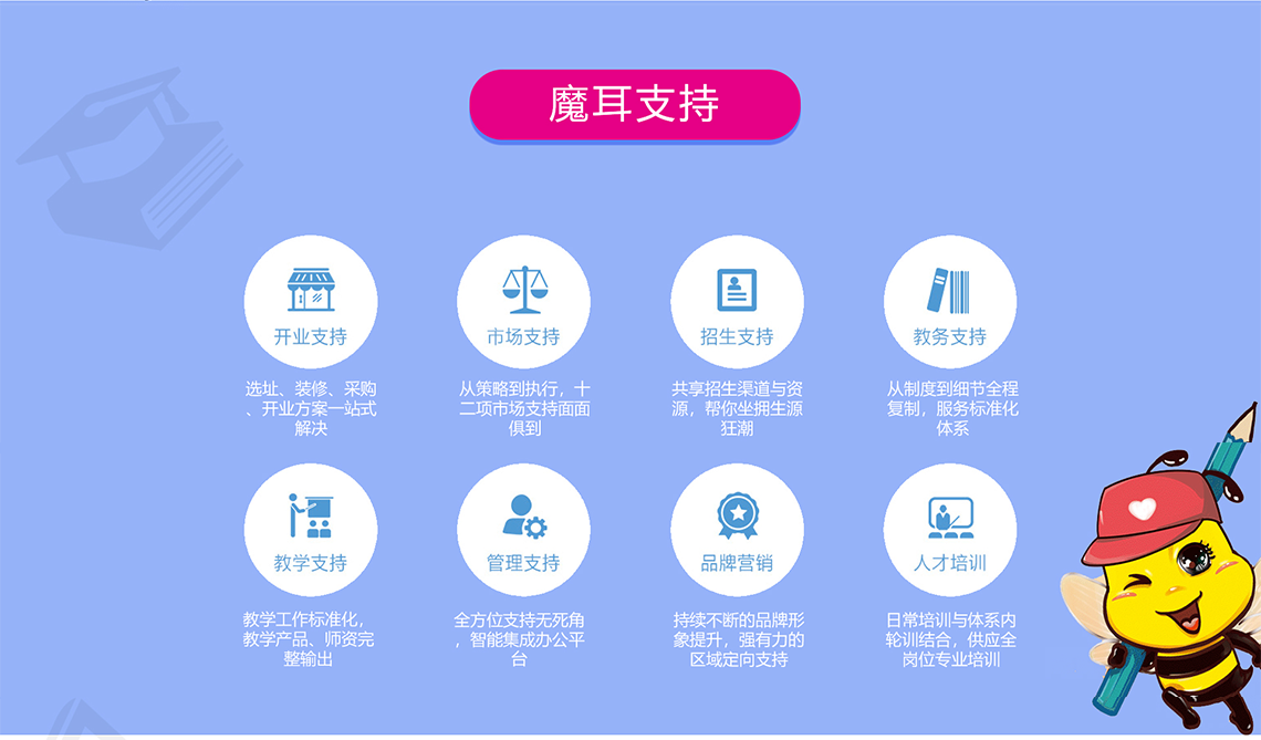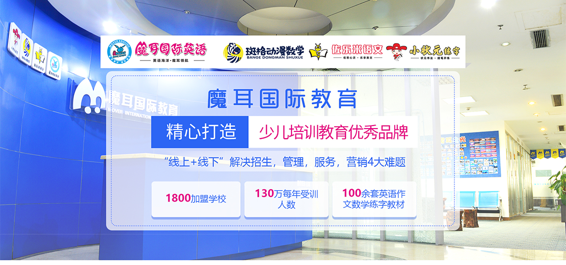 魔耳国际教育认真贯彻国家教育事业发展纲要,致力于中国青少年的基础英语普及教育,力求使全国青少年都能学到地道实用超值的英语。力争成为中国“语言培训提供方案的卓著领导者”!魔耳国际教育每一步都步履坚定、力度空前,收获了长足的进步。从2003年先后在湖南,湖北等地开始办学,从2010年7月开始面向全国进行加盟连锁办学。目前,在全国创办分校1000逾所,在校人数70万以上,每年受训人数高达120余万人,已覆盖国内31个省级行政区,成为首家覆盖中国大陆所有省级行政区的大型教育连锁品牌!