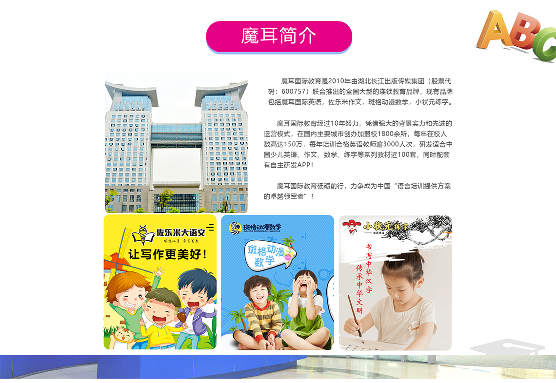 魔耳国际教育连锁品牌于2010年创立于湖北武汉,隶属于长江出版传媒集团,多年来,魔耳国际教育凭借丰富的教学经验,创新务实的发展方向,秉承“超前学习”的教育理念,以超群的品牌实力,卓越的教学质量,培养出了数百万名综合能力强、极具时代性的英语精英人才。如今,魔耳国际教育已成为中国少儿英语培训行业的先行者和领航者。