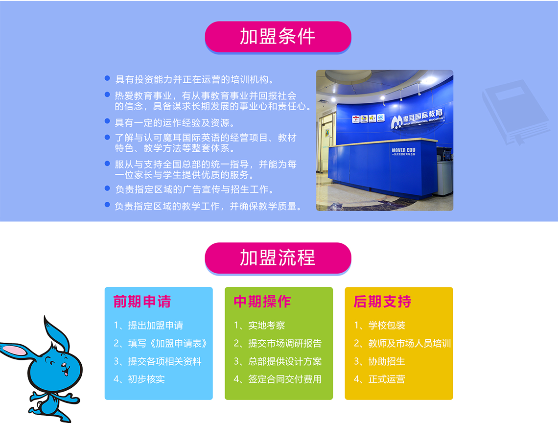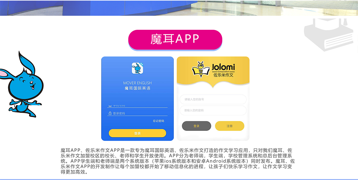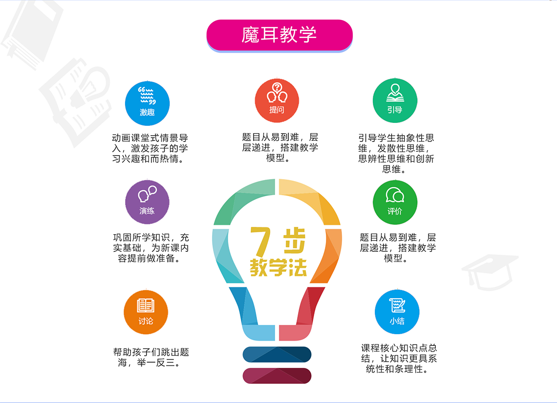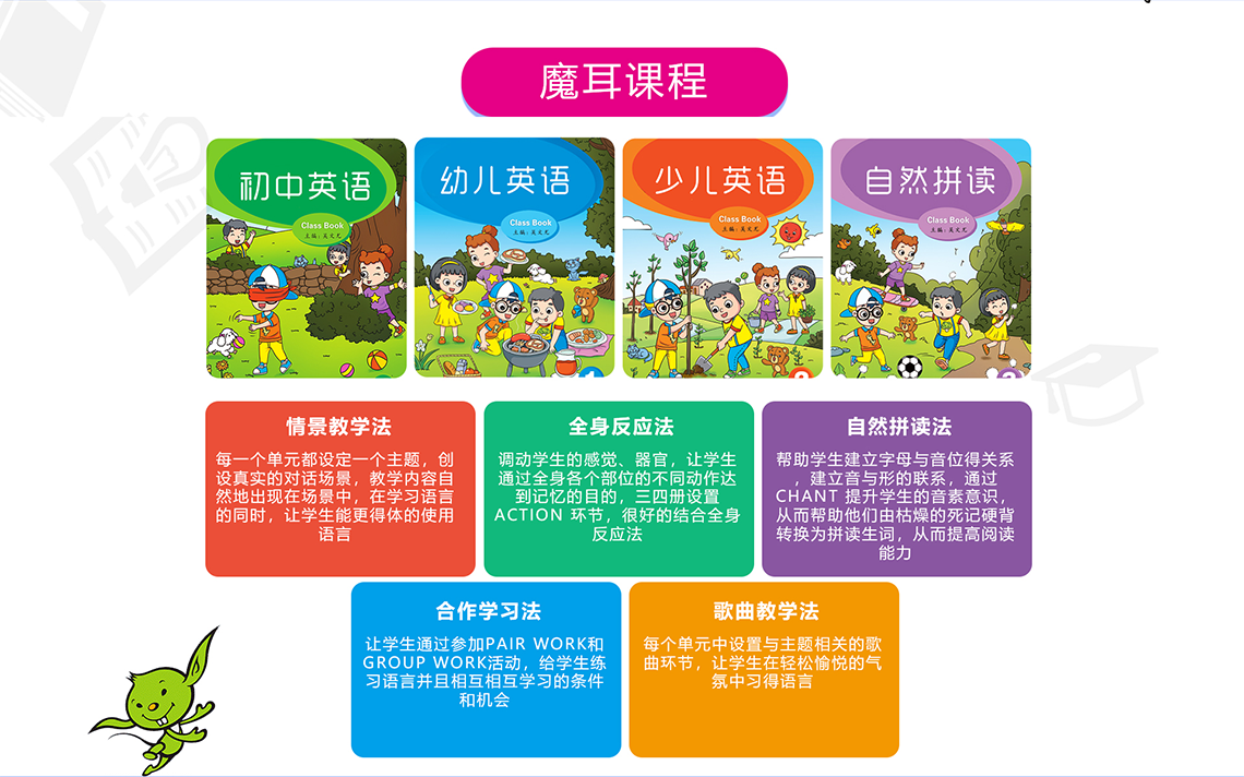 魔耳国际教育秉持“崇文、惟诚、务实、创新”的校训,以诚信为本,服务于社会、家长和学生。魔耳国际教育在英国伦敦专门成立了Under One Sky 公司(国家级批准海外文化公司)作为魔耳国际教育教材研发、课程设计和师资培训的基础与后盾,以专业独创的“四步多元教学法”、完整贴心的教学服务、丰富多彩的教学道具,为中国3-14岁的幼、少儿量身打造全方位立体式英语课堂。