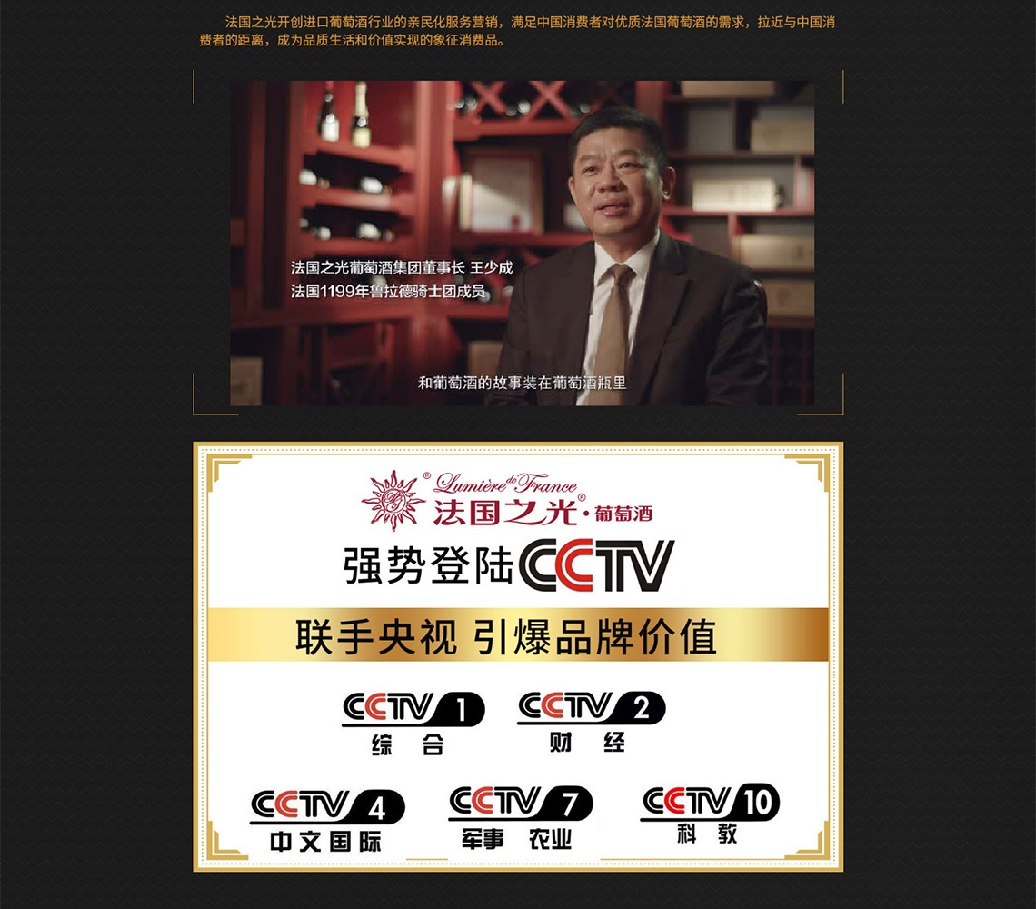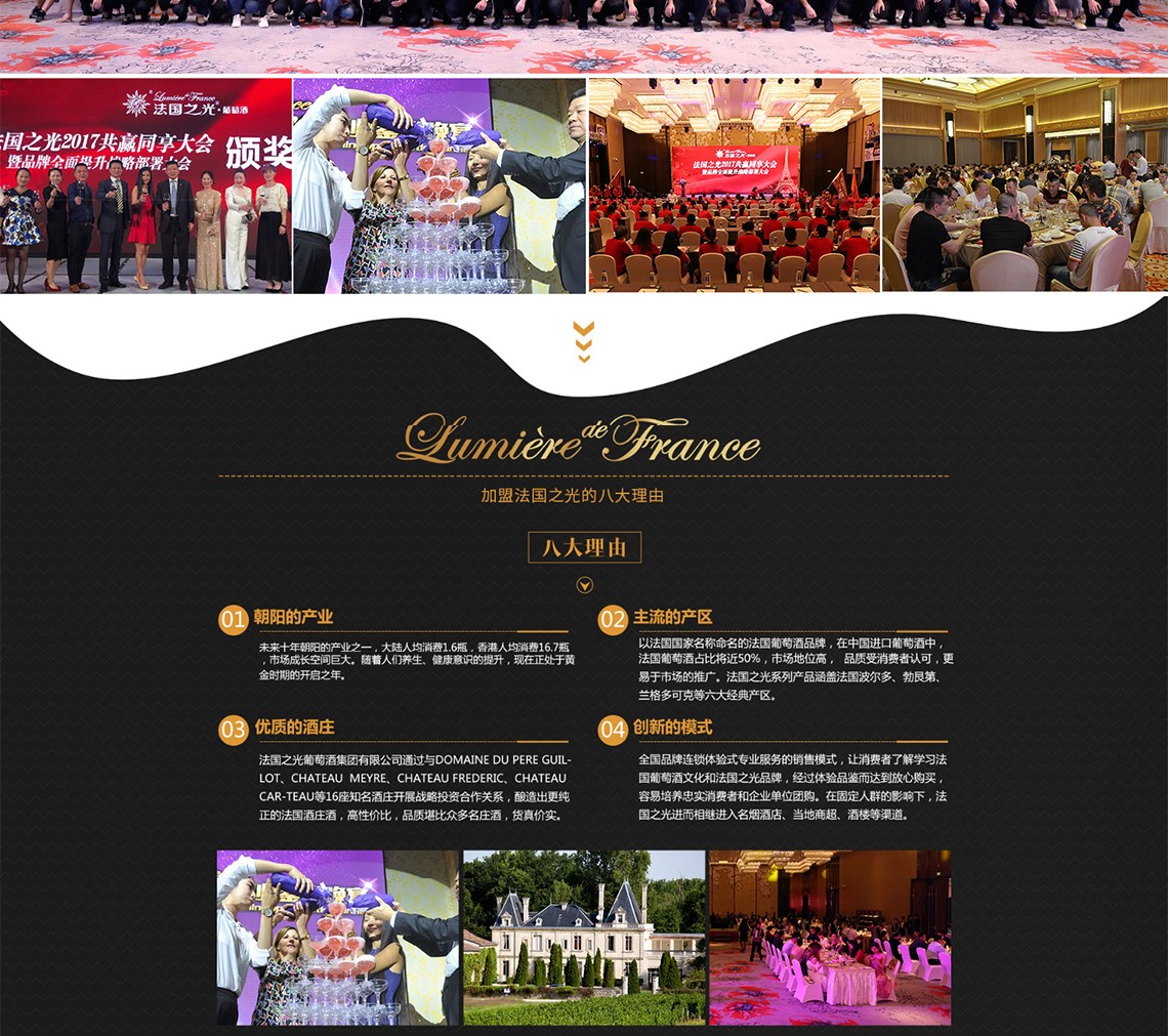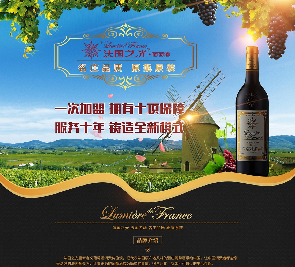 法国之光葡萄酒品牌源自其法文商标Lumiere de France,法文意为法国的光芒,是起源于1911年的百年葡萄酒庄品牌,品牌开创的全产业链品质控制和体验式服务模式,全国品牌体验店超600家。