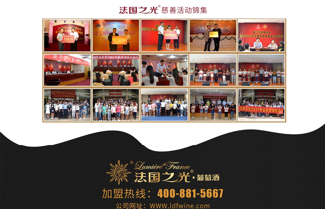 法国之光葡萄酒不仅致力于商业,对慈善公益事业上更是孜孜不倦。法国之光助学圆梦基金从2011年到2017年先后资助超过700名大学生完成大学梦,承担起了企业发展的社会责任。