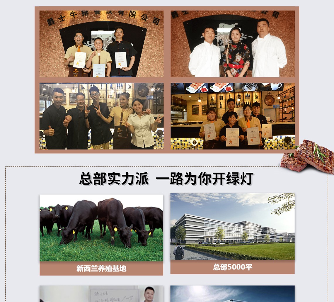 如今,爵士牛排已拥有自建5000平牛排生产基地、进出口贸易公司、爵士商学院、前厅后厨督导等集团服务体系,同时主推单点牛排和牛排自助加盟店经营模式,满足市场需求。