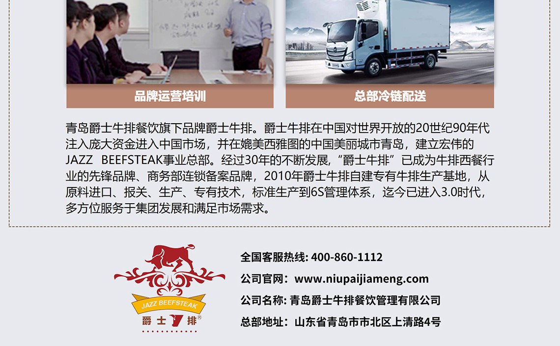 爵士牛排是青岛爵士牛排餐饮有限公司旗下品牌。自20世纪90年代成立,经过26年发展,爵士牛排门店覆盖32个省市及缅甸市场,成为中国十大牛排馆加盟店排行前三名的牛排加盟品牌、商务部备案特许连锁加盟品牌。