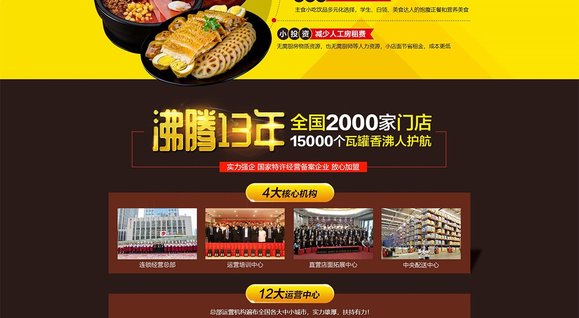 2006 年,瓦罐香沸第一家直营店面启动,预示着瓦罐香沸正式进入中式营养快餐行业并成为市场代表品牌。经3年深入的市场摸索、工艺修整、经验积淀,2009 年,瓦罐香沸加盟连锁正式开始面向全国招商,其势如破竹。其后年间,面对市场的浪潮,瓦罐人不断专研、精益求精,对瓦罐容器及菜品进行改革与升级,打开小瓦罐中式营养快餐的新篇章,获得市场及政府的各项荣誉奖项!2017 年,瓦罐香沸签约巴基斯坦代理商,正式走出国门!2018年“瓦罐香沸”获得中国驰名商标。