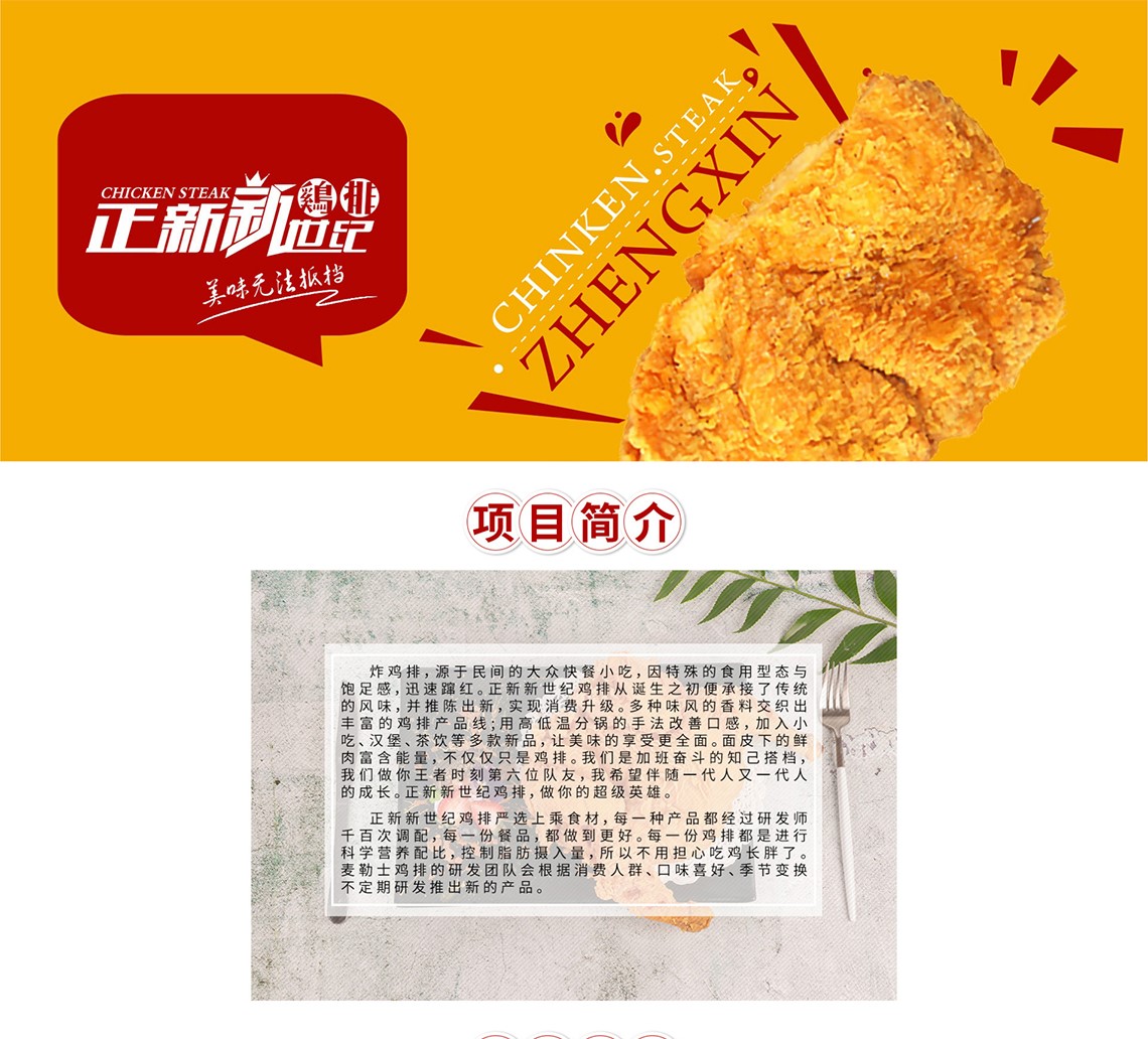 炸鸡排,源于民间的大众快餐小吃,因特殊的食用型态与饱足感,迅速蹿红。正新新世纪鸡排从诞生之初便承接了传统的风味,并推陈出新,实现消费升级。多种味风的香料交织出丰富的鸡排产品线;用高低温分锅的手法改善口感,加入小吃、汉堡、茶饮等多款新品,让美味的享受更全面。面皮下的鲜肉富含能量,不仅仅只是鸡排。我们是加班奋斗的知己搭档,我们做你王者时刻第六位队友,我希望伴随一代人又一代人的成长。正新新世纪鸡排,做你的超级英雄。