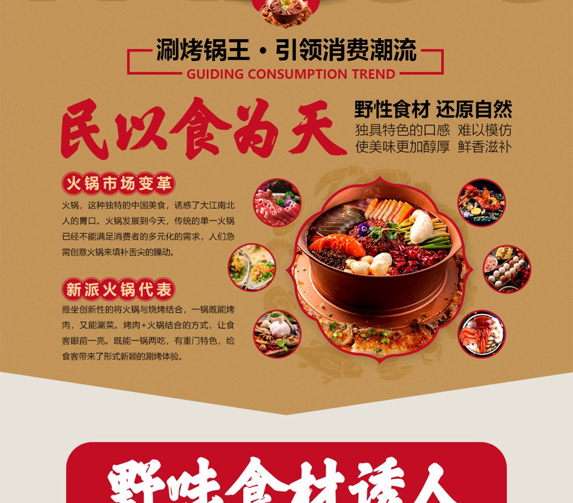 品牌号召力与强大的餐饮从业经验,精准定位,把脉受众的消费心理,打量餐饮的流行趋势。雅坐涮烤锅王的整体装修风格狂野任性,新颖动