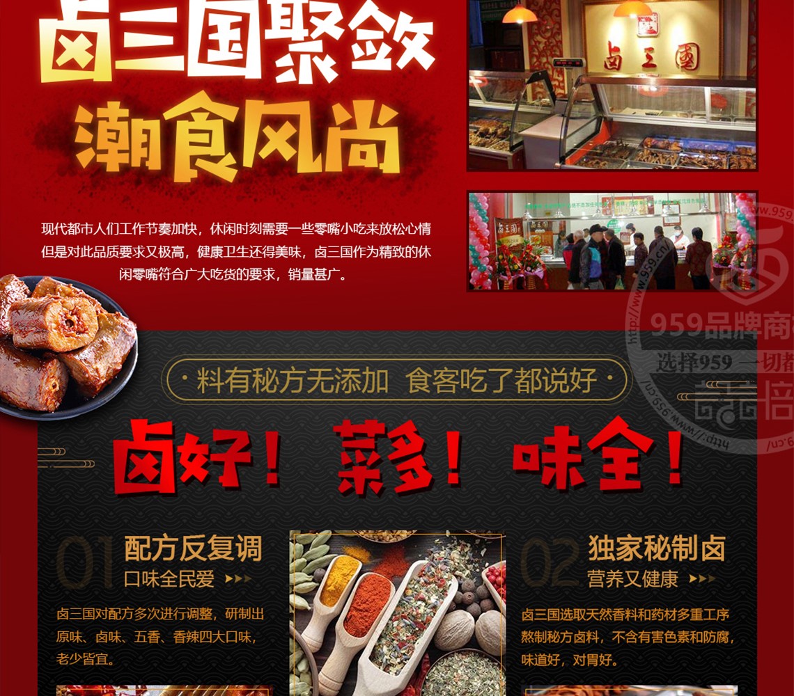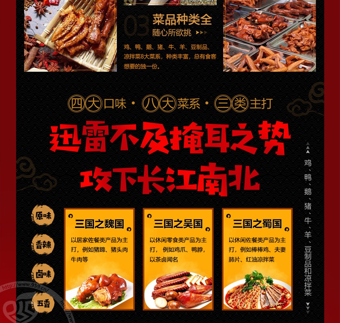 中国熟食卤味文化传承了千余年,卤三国不断挖掘传统饮食文化,将焖卤工艺与现代饮食习惯相结合,研发出多道经典焖卤菜品,引发行业内外广泛关注。经过多元运作,卤三国运用祖传曹氏独特秘制配方结合现代食品加工技术,研究开发了“绿色、健康、美味、奇香”为一体的“卤三国”卤味系列产品,以“绿色、健康、无添加”为根基而广受好评。