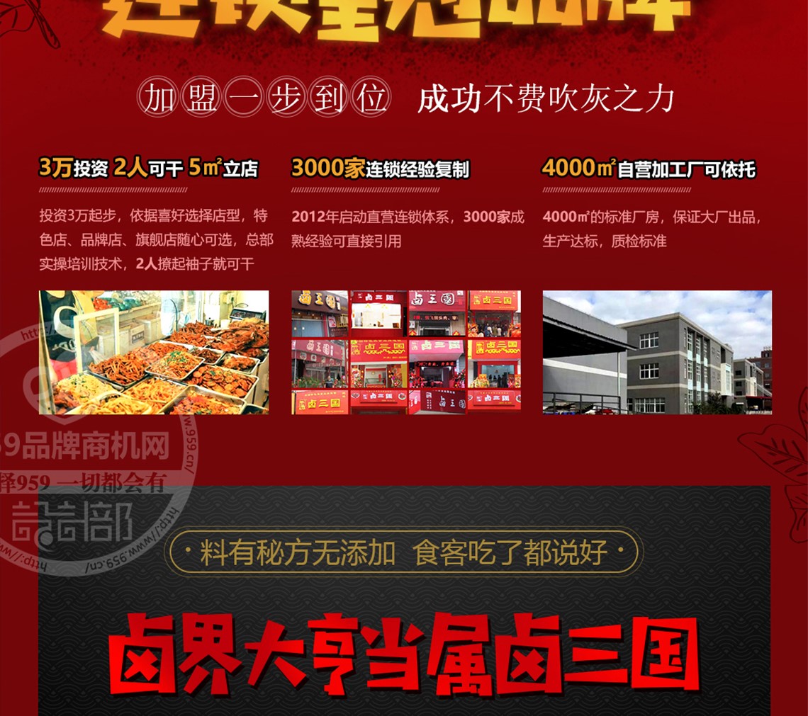 卤三国运用曹氏独特秘制配方结合现代食品加工技术,研究开发了“绿色、健康、美味、奇香”为一体的“卤三国”卤味系列产品,并于2012年起启动总部直营体系发展战略,以“绿色、健康、无添加”为根基而广受好评,除正常经营外,直营店还供公司合作伙伴在总部学习结束后实操所用,实操包含店面经营管理、服务礼仪、产品切配、拌料调制、营业报表、店面促销、顾客接待等综合实践内容,从而达到合作商学习结束后可以直接开店,复制总部直营店成功经验。