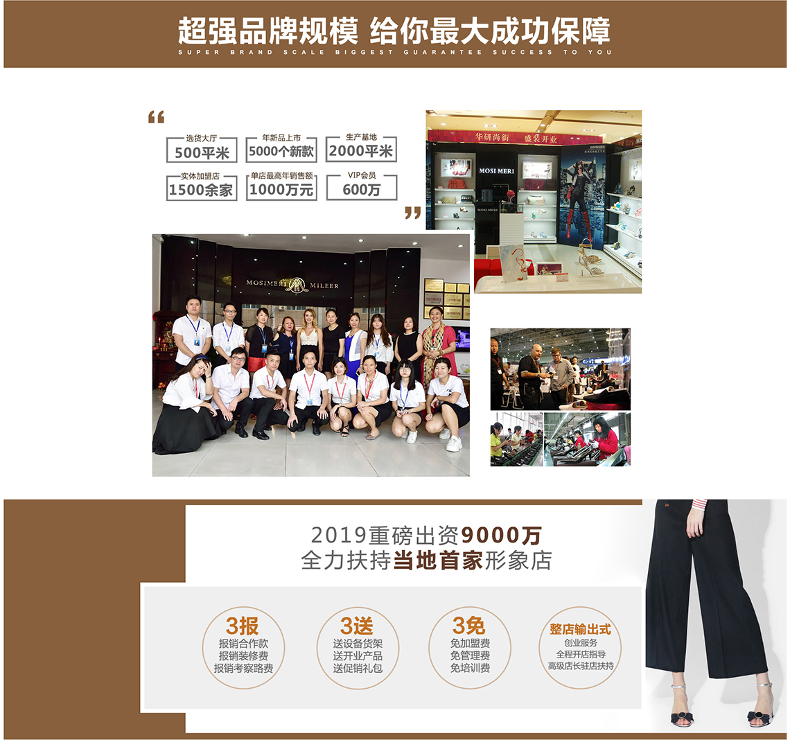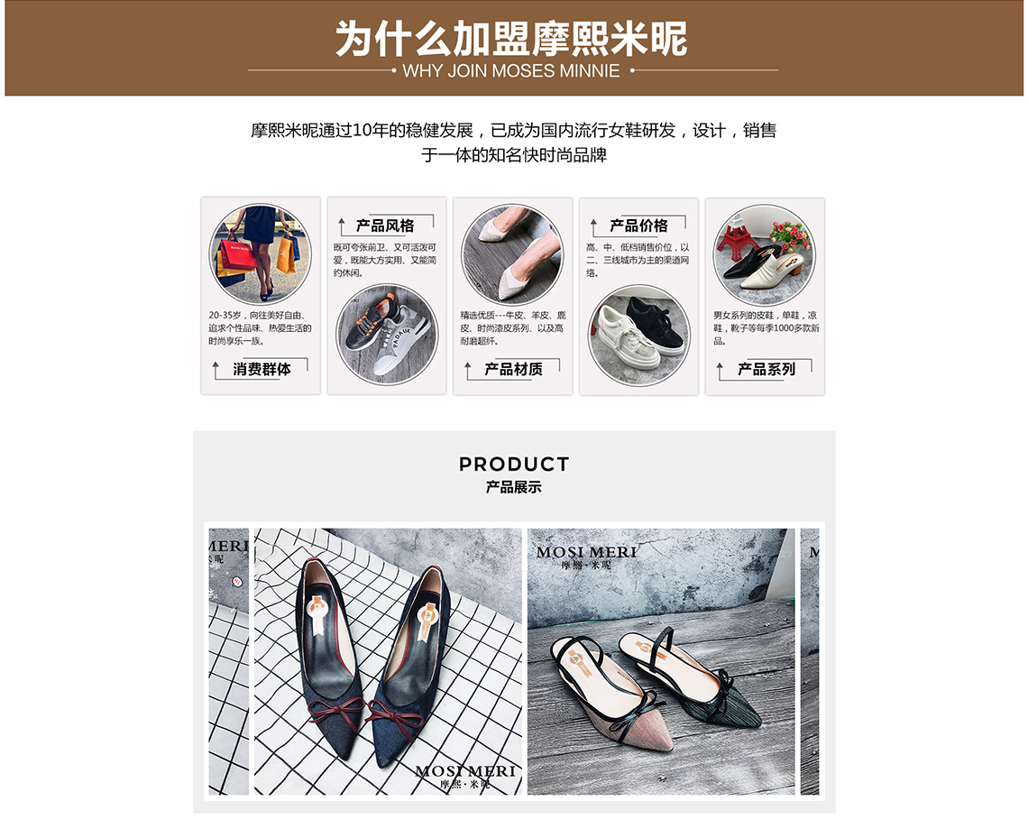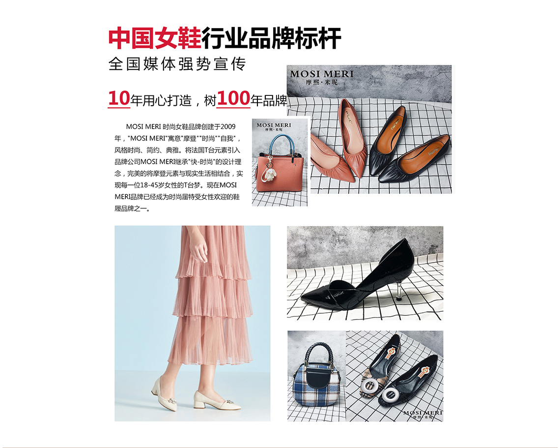 摩熙米昵女鞋品牌风格涵盖中高端时尚以及大众时尚,核心客群以20-45岁女性消费者为主。摩熙米昵女鞋昵秉承诚信立本,创新发展的经营方针,获得了社会广泛的认同和信赖。摩熙米昵女鞋通过提升品牌影响力、整合优化资源、提升创新能力、拓展亚洲市场等举措,全面实现公司的持续发展,将公司打造成为引领中国女性时尚产业的重要力量。