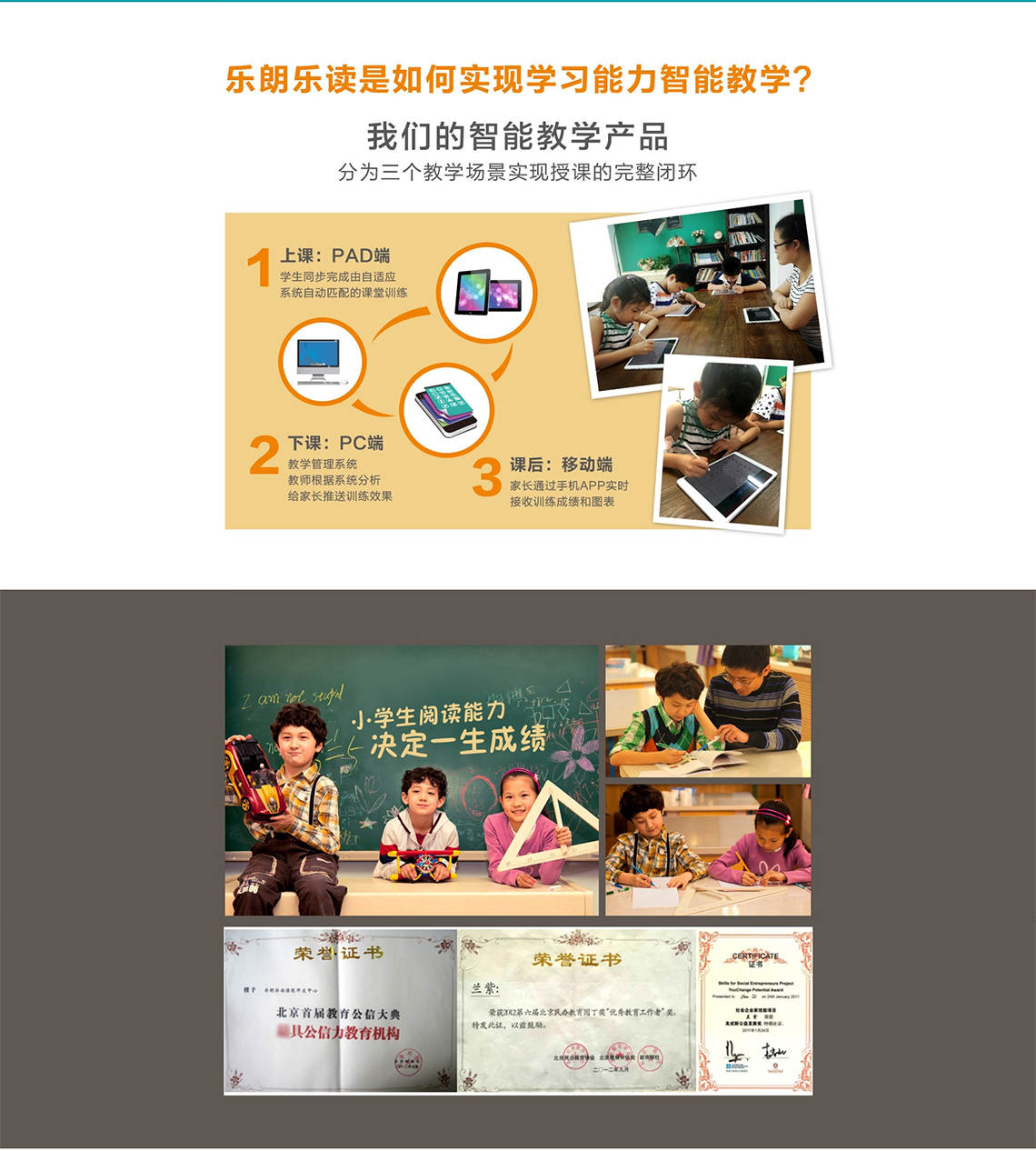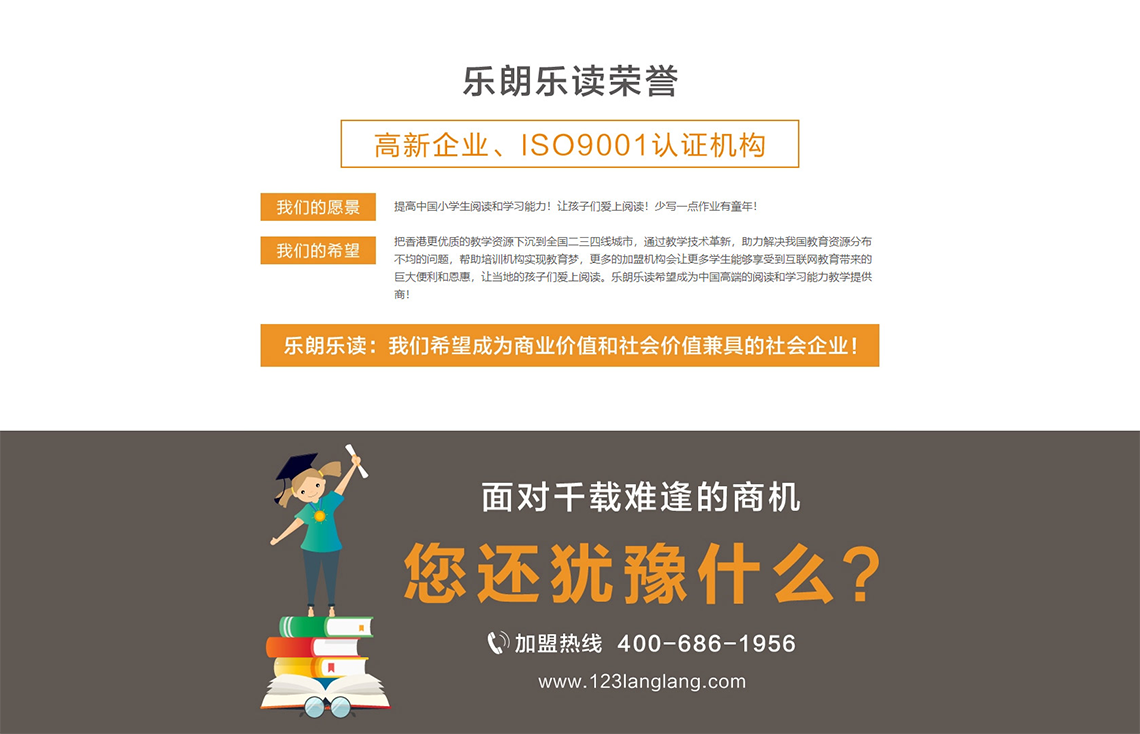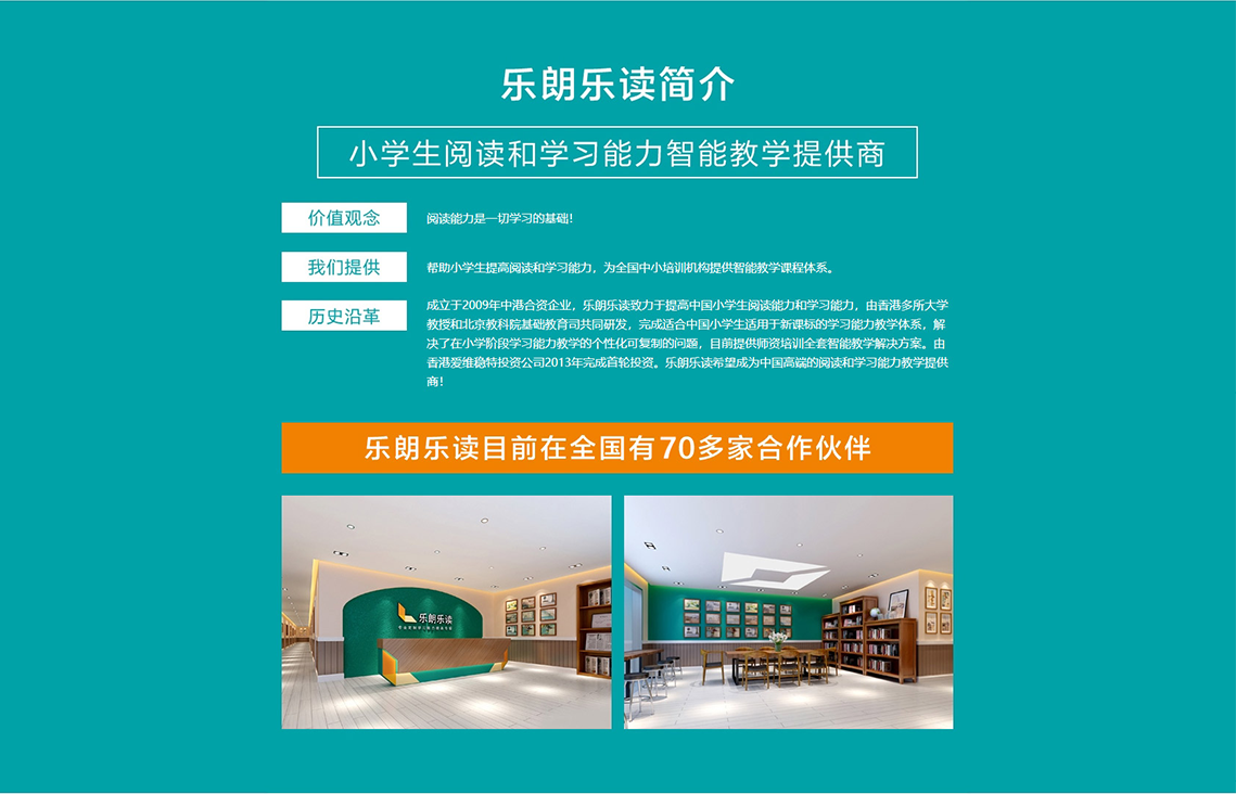 乐朗乐读 ,阅读能力提高专家,成立于2009年,是中国目前唯一儿童阅读能力在线教学技术提供商。 以线上、线下综合平台形式,提供全面阅读能力提高方案,由香港阅读能力解决领域教授共同研发课程,“教师在线教学平台”解决了质量统一,个性化教学问题,是国内少有的同班不同教材的在线内容提供商。2012年12月获得香港爱维稳特投资,目前是中外合资高新技术企业。