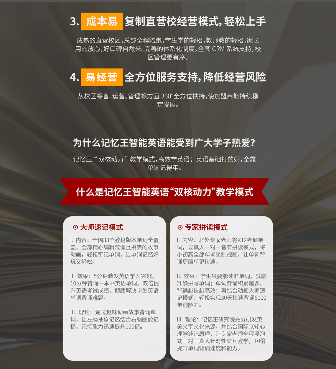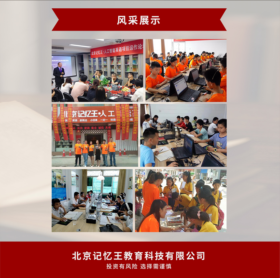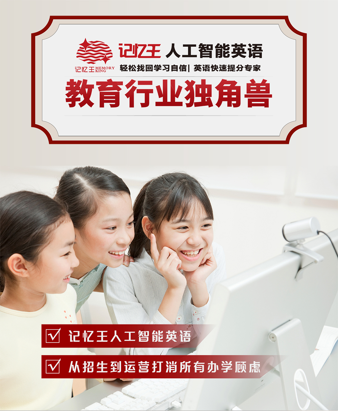 公司顺应“互联网+教育”的时代潮流,经历十年研发出“记忆王人工智能英语课程”,未来将成为中国具有竞争力的教育企业之一。记忆王人工智能英语采用先进的人工互动教学模式,使用《最强大脑》同款记忆法,把被动式学习变成主动思考式学习。多维度训练学生的速记、听、说、读、写、译,为学生深度制定专属课程,累计服务学院超百万,从学习根源上补起,不断为学生减压减负,从而使英语成绩得到提升。