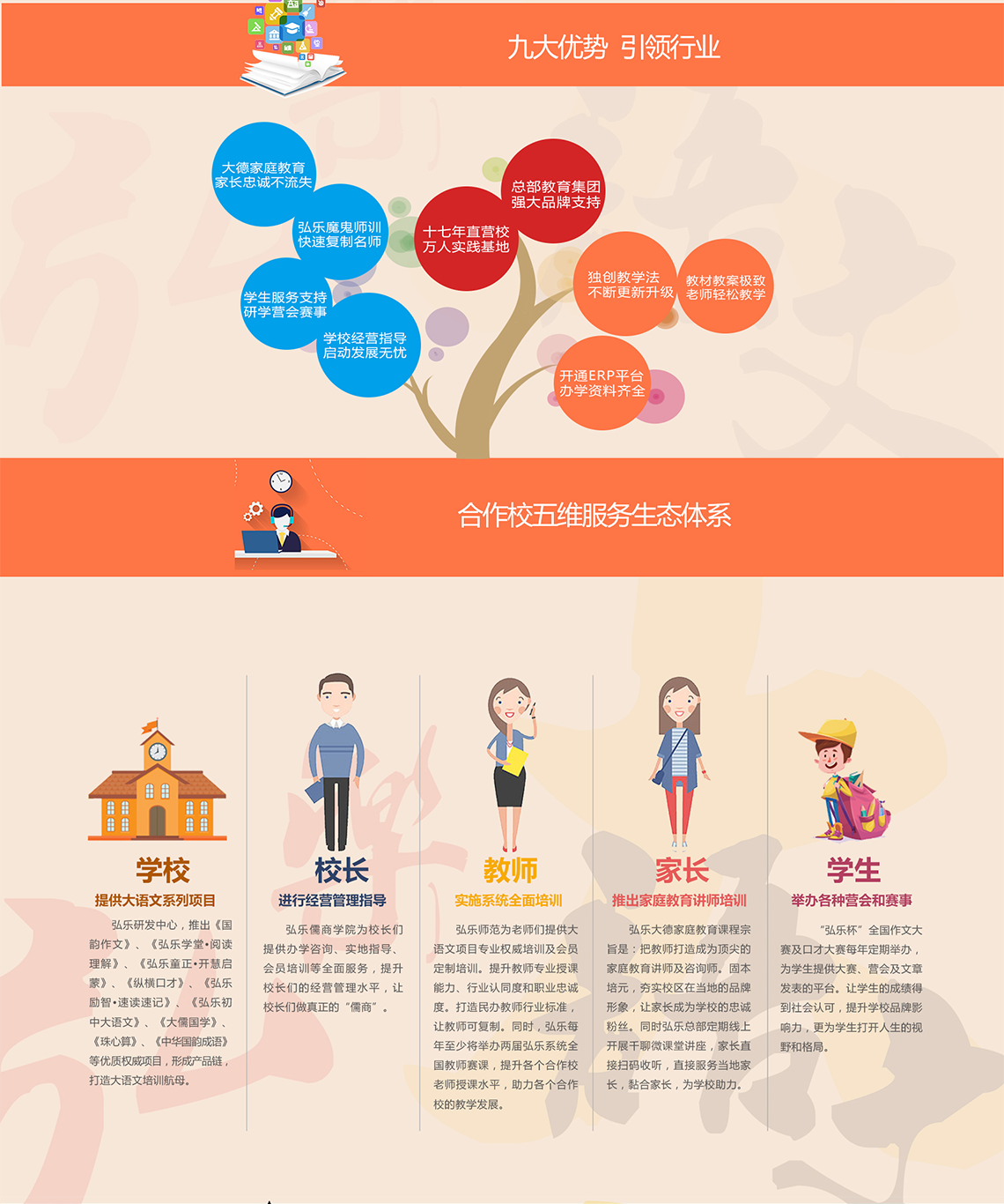 弘乐教育,合作校五维服务支撑体系,从学校、校长、老师、家长、学生,五个维度, 立体化支撑,助力合作校稳健发展!