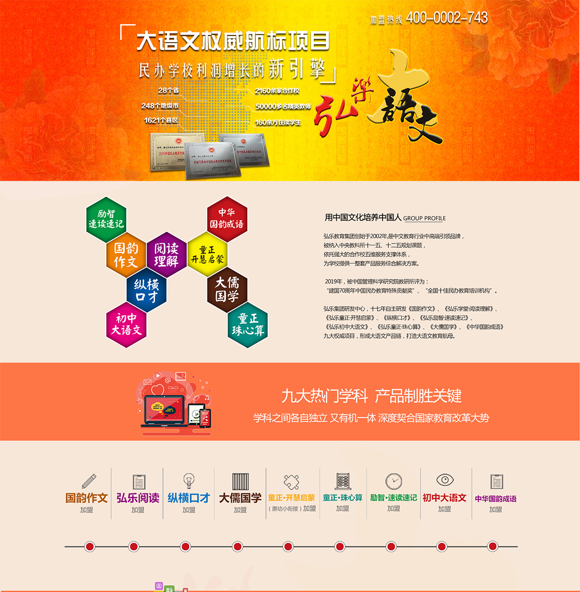 弘乐研发中心,十七年自主研发《国韵作文》、《弘乐学堂·阅读理解》、《弘乐童正·开慧启蒙》(原幼小衔接)、《纵横口才》、《弘乐励智·速读速记》、《弘乐初中大语文》、《弘乐童正·珠心算》、《大儒国学》、《中华国韵成语》九大权威项目,形成大语文产品链,打造大语文教育航母。