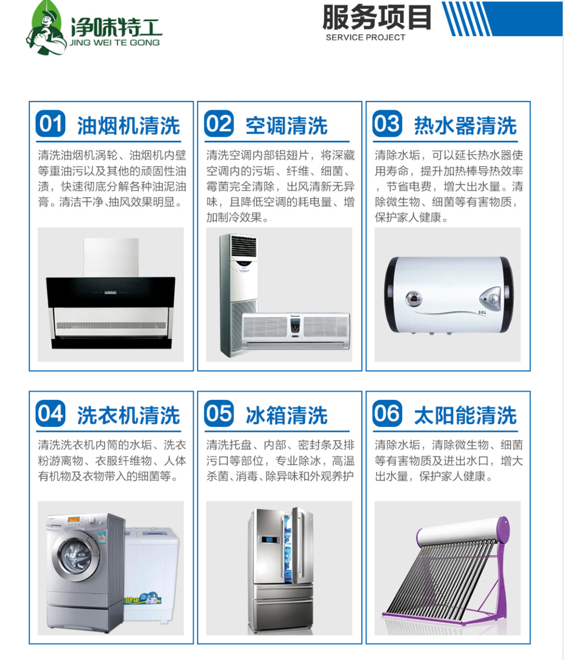 2、什么是家电清洗:所谓家电清洗就是对家用电器进行清洁的保养,以增加家电运作效率以及使用寿命,使人们更好的利用家电,保持家庭清洁使人们更加健康。家电清洗包括电器很多:饮水机、油烟机、空调、电冰箱等一些经常使用的家用电器,他们的清洗方法分别不同。