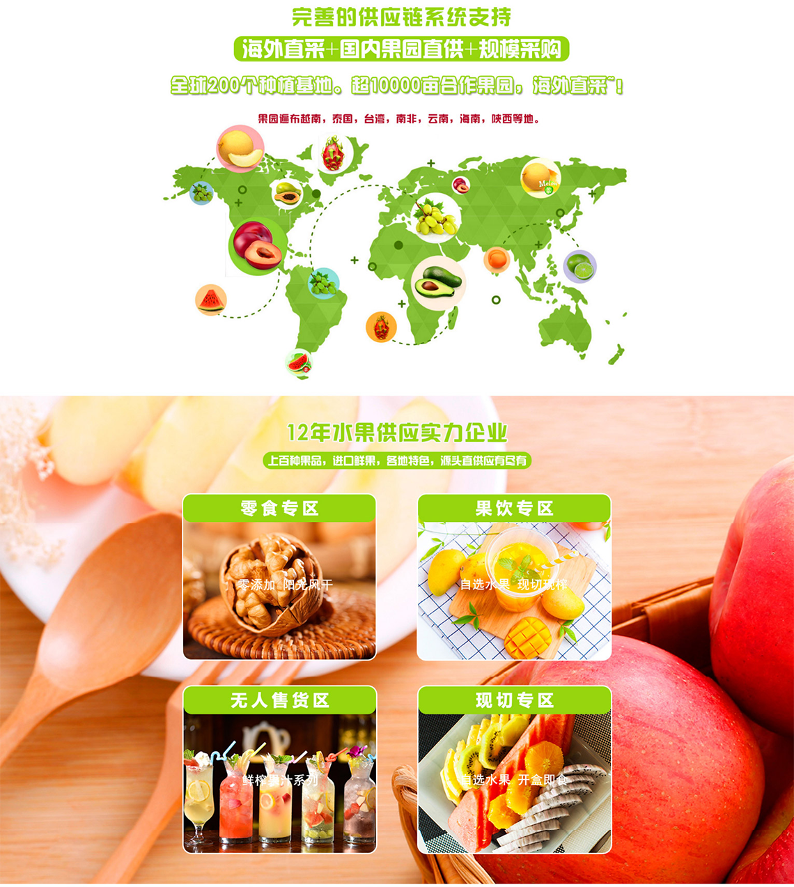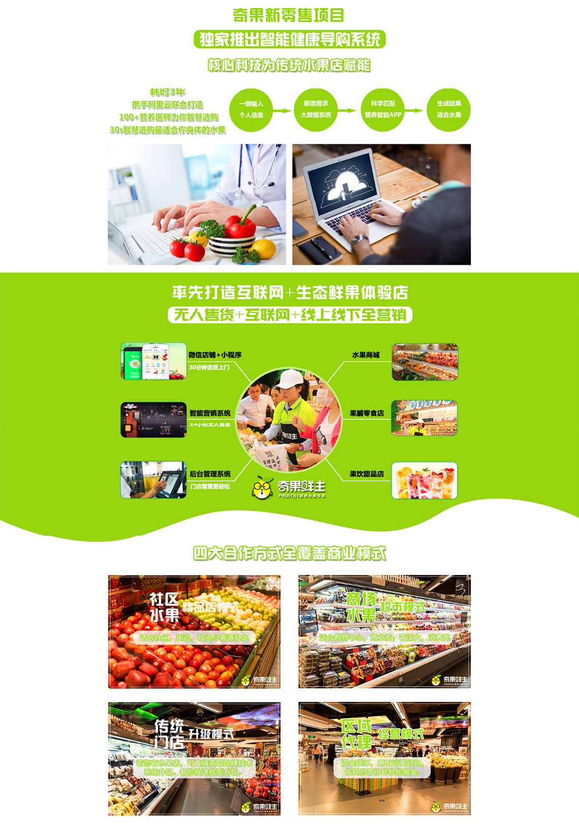 奇果鲜生充满新零售基因,鲜果大本营团队除了建立全球鲜果供应链,并耗时3年走访请教国内知名的营养管理师,联合阿里云打造出了中国鲜果行业首个健康管理推荐系统,已注册专利。消费者只要来到店输入基础的身体信息,我们就会根据这些信息推送最适合他身体状态的水果品类。为消费者提供新鲜平价对味的鲜果,是鲜果大本营的使命,也是奇果鲜生存在意义与核心竞争力。