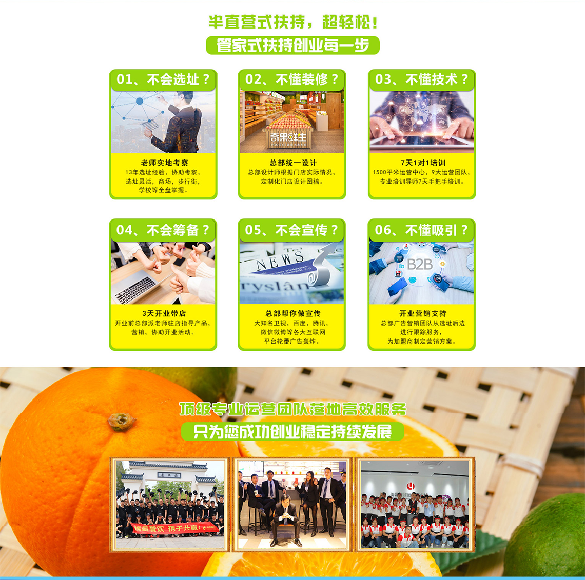 奇果鲜生果品水果店加盟项目帮助创业投资者可以实现选址开店,旗开得胜,免费提供门店宣传、经营证件、员工技术培训教材、经营管理系统方案等等重要内容。奇果鲜生加盟项目可以帮助创业投资者实现强大培训、驻店帮扶。总部设有专门的人才培训基地,输送高素质的营业员、店长等精英性人材到各加盟店铺帮助创业投资者经营。