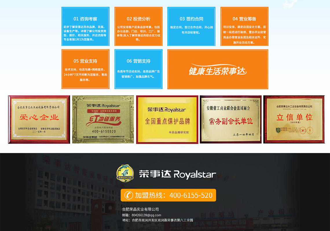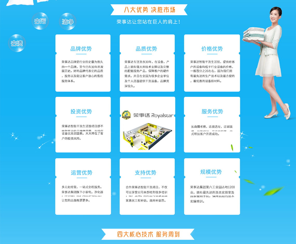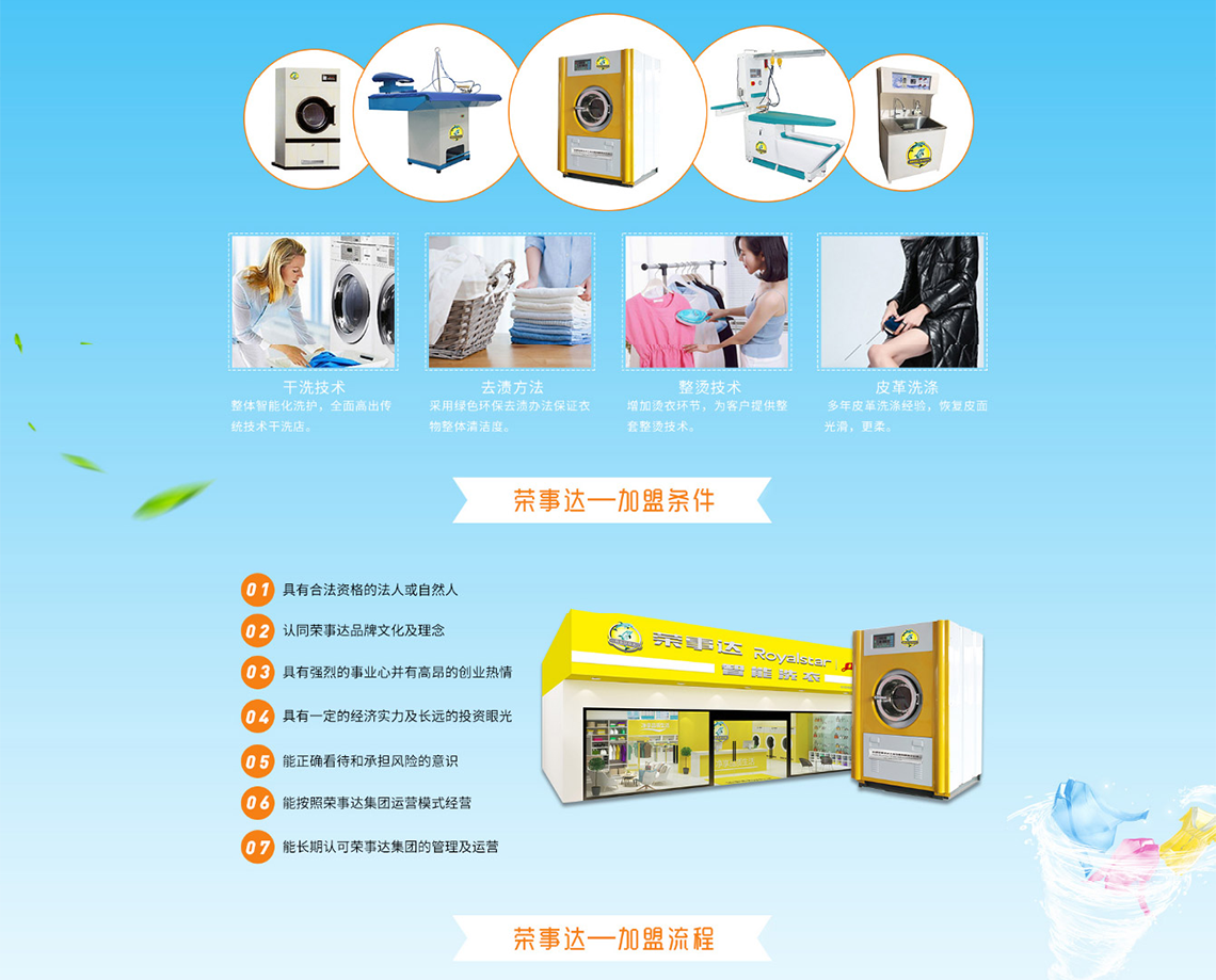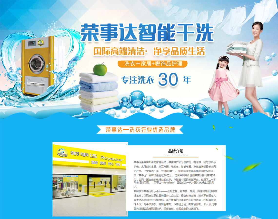 荣事达——打造中国专业洗衣品牌:得力于荣事达专注洗衣设备30余年得天独厚的研发生产技术优势,荣事达水工业公司开始涉及干洗设备的研发与制造,陆续设计研发生产出了“全自动变频石油干洗机”、“全自动全封闭四氯乙烯干洗机”、“全自动水洗机”、“全自动烘干机”、“全自动洗脱烘一体机”等一系列工业洗衣设备。并为企业、酒店、单位和个人提供水洗工厂、水洗房、干洗店等解决方案。在全国发展至今有超过数千家企业及个人在使用我们生产制造的洗衣设备。