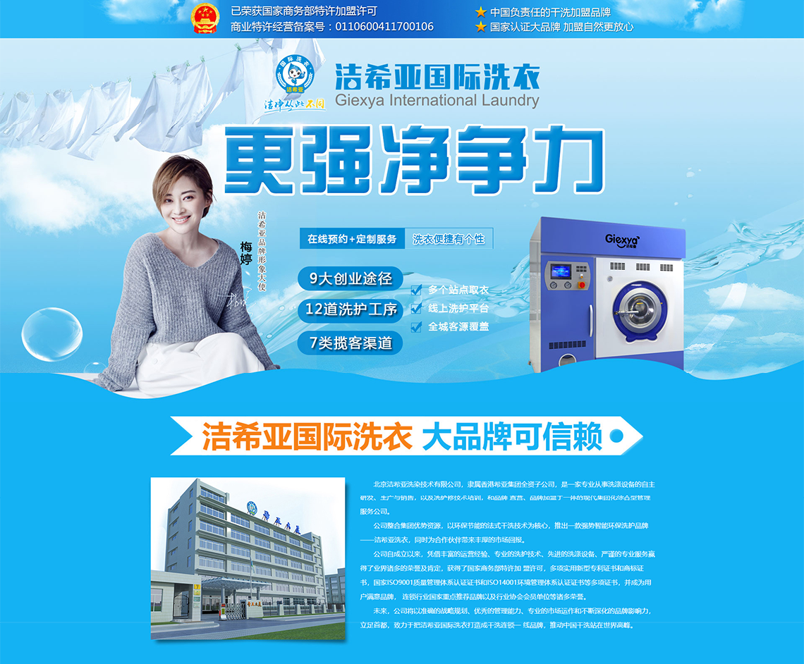洁希亚国际洗衣业务遍及全国30多个省、市、自治区和地区,被行业专家一致认可为未来中国竞争力的干洗养护品牌,洁希亚国际洗衣品牌目前正处在高速发展的黄金期,洁希亚致力于将干洗行业打造成一个绿色环保的行业,并打造亚洲干洗连锁加盟品牌。