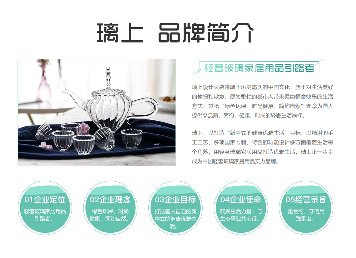 以打造“新中式的健康优雅生活”目标,璃上正一步步成为中国轻奢玻璃家居用品第一品牌。