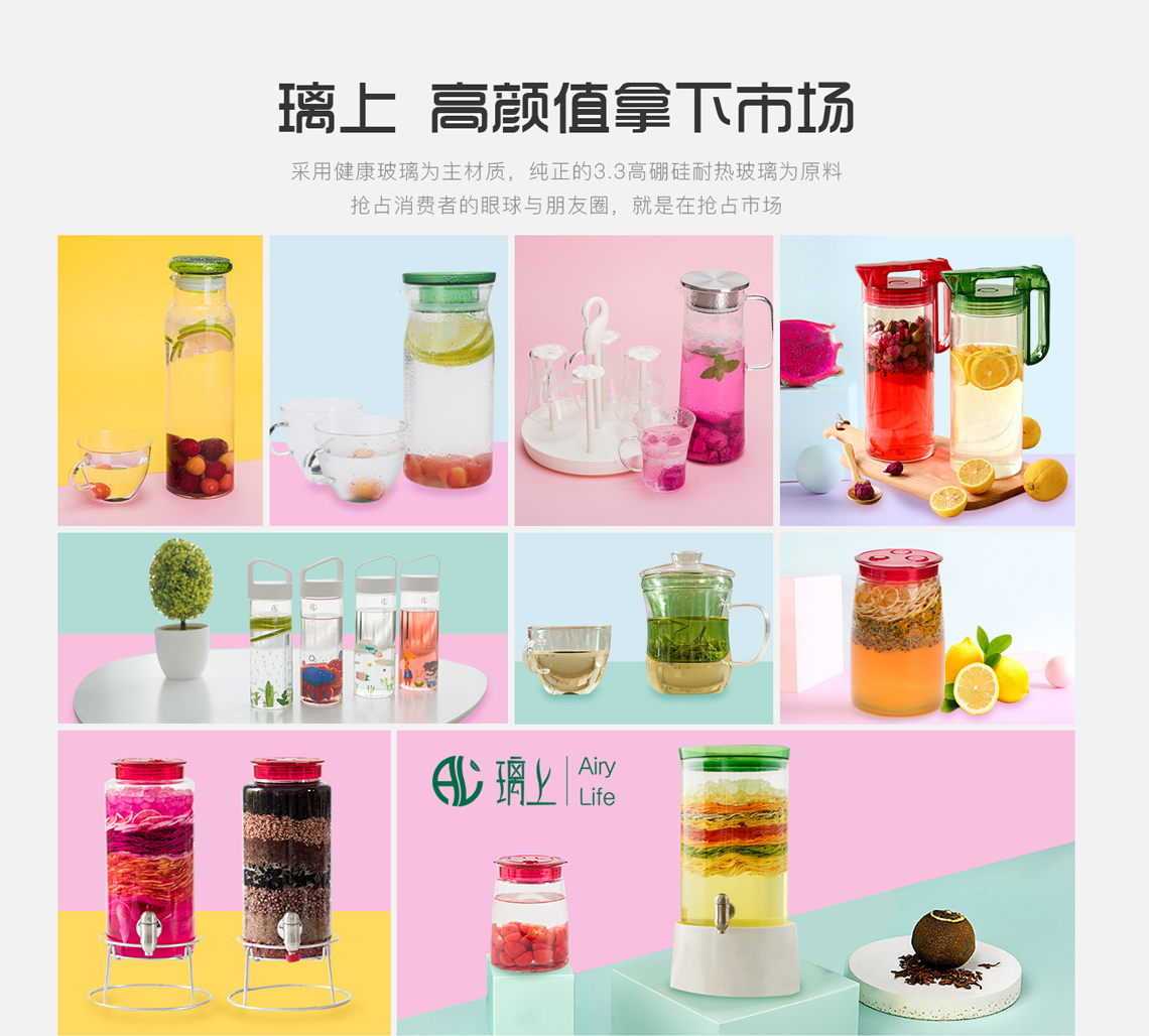 璃上品牌拥有茶具水具、烘焙制食、花瓶花插、储物储酿、厨房制备五大产品系列,致力于用美丽、清透的玻璃家居用品为消费者奉上优雅的生活享受。以“花、种子、果实”养生为基础,解放生活琐事对美丽、健康、梦想的追求。