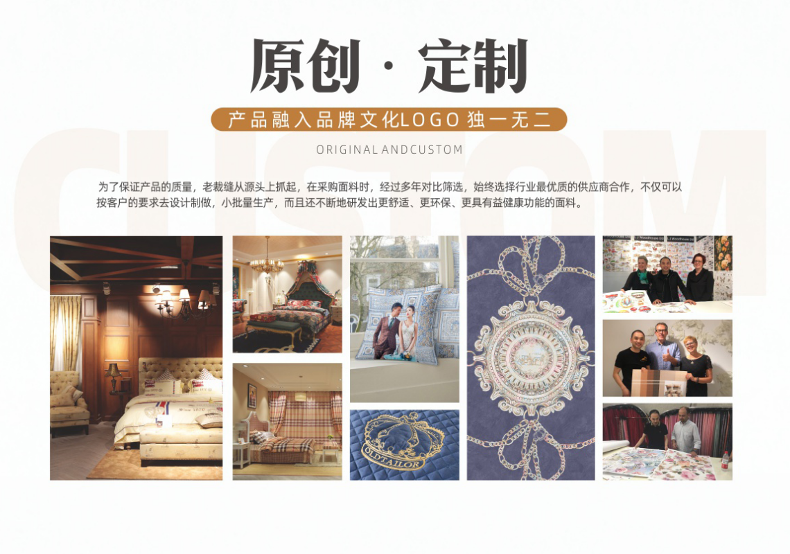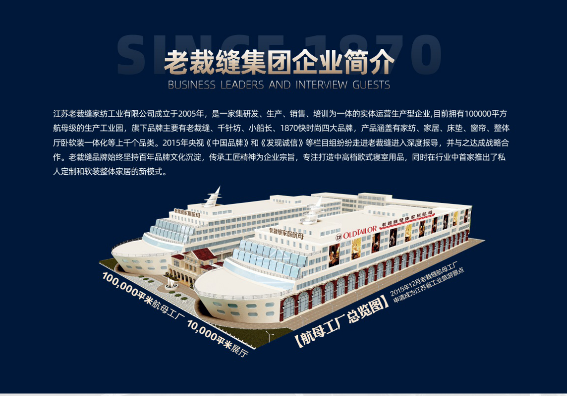 老裁缝家纺目前拥有100000平方米的航母生产工业园,及20000平方米的豪华展厅,以“引导时尚、引导市场、服务社会”的企业精神, 凭借先进的缝制工艺技术和研发实力,将传统的缝制与现代工艺相结合。