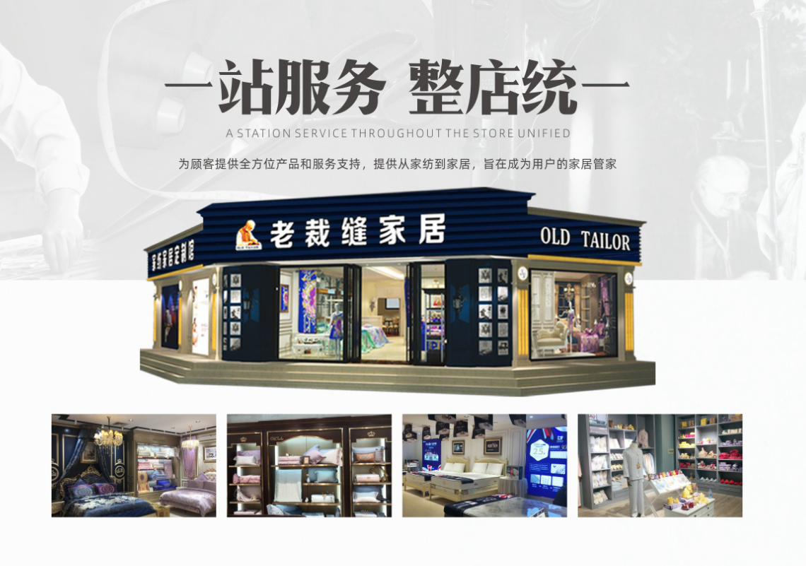 江苏老裁缝家纺工业有限公司集开发、生产、销售、培训为一体的大型实体运营生产型企业,05年进驻中国市场,旗下老裁缝家纺和千针坊家纺两大品牌,推行独家代理和品牌专卖店经营相结合的专业南通家纺品牌模式。老裁缝家纺作为真正的实体运营企业,始终以诚信为第一前提。让消费者享受到产品的价值、让家纺加盟者得到丰盈的 效益,实现互利双赢的经营理念是江苏老裁缝家纺工业有限公司迅速拓展市场的动力源泉。目前,销售网络已覆盖全国各大中小城市。