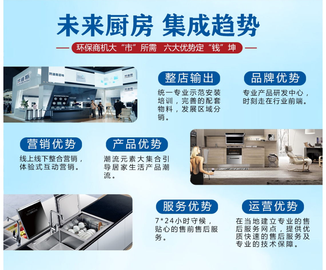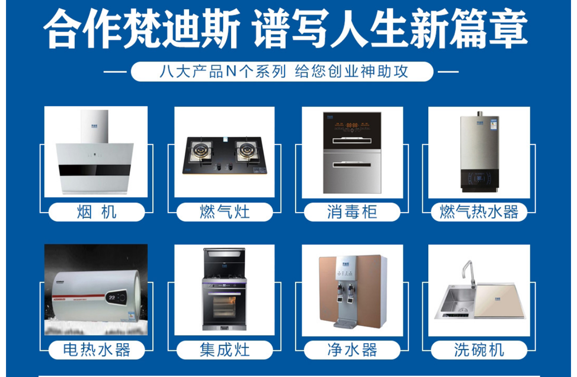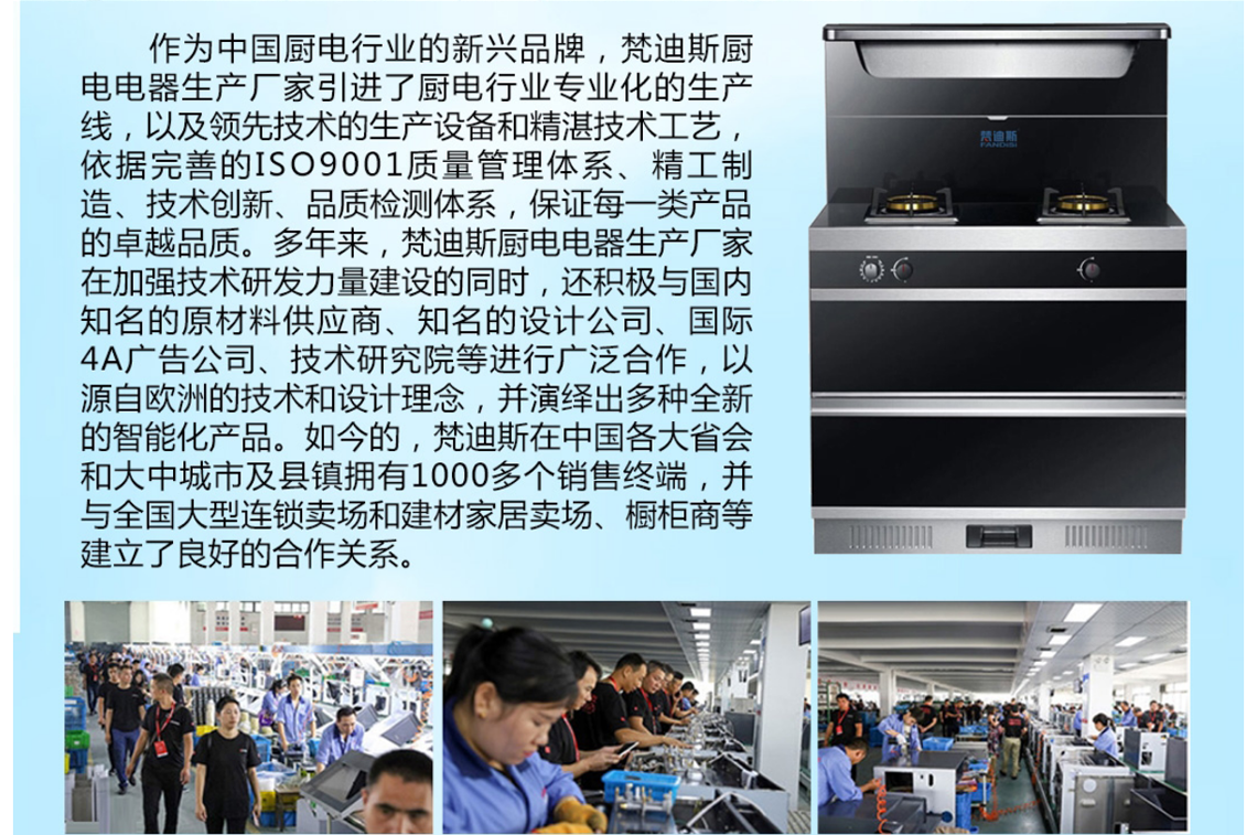 梵迪斯厨电加盟品牌作为厨卫行业的新兴品牌,梵迪斯厨电生产厂家引进了厨卫行业专业化的生产线,以及技术的生产设备和精湛技术工艺,依据完善的ISO9001质量管理体系、精工制造、技术创新、品质检测体系,保证每一类产品的质量。梵迪斯厨电加盟品牌是一家集研发、生产和销售为一体的厨卫电器品牌,产品类别覆盖了集成灶,洗碗机,吸油烟机、燃气灶具、消毒柜、燃气热水器、电热水器,壁挂炉,远红外电暖器等系列产品,以人性化、智能化、时尚化的"梵迪斯厨卫”电器产品不断创造完美的厨房品质空间,产品深受国内消费者的青睐。